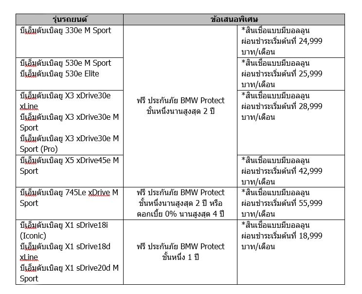 -สำหรับผู้ประกอบการธุรกิจ SME ที่เป็นลูกค้าเดิมของบีเอ็มดับเบิลยู และสั่งจองรถยนต์บีเอ็มดับเบิลยู 330e M Sport, 530e Elite, 530e M Sport, X3 xDrive30e xLine, X3 xDrive30e M Sport (Pro) และ X5 xDrive45e M Sport จะได้รับสิทธิประโยชน์ดังต่อไปนี้