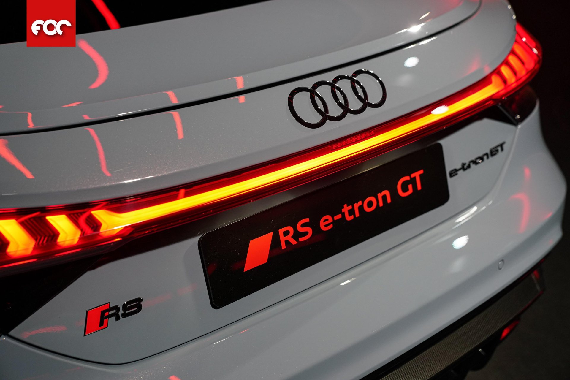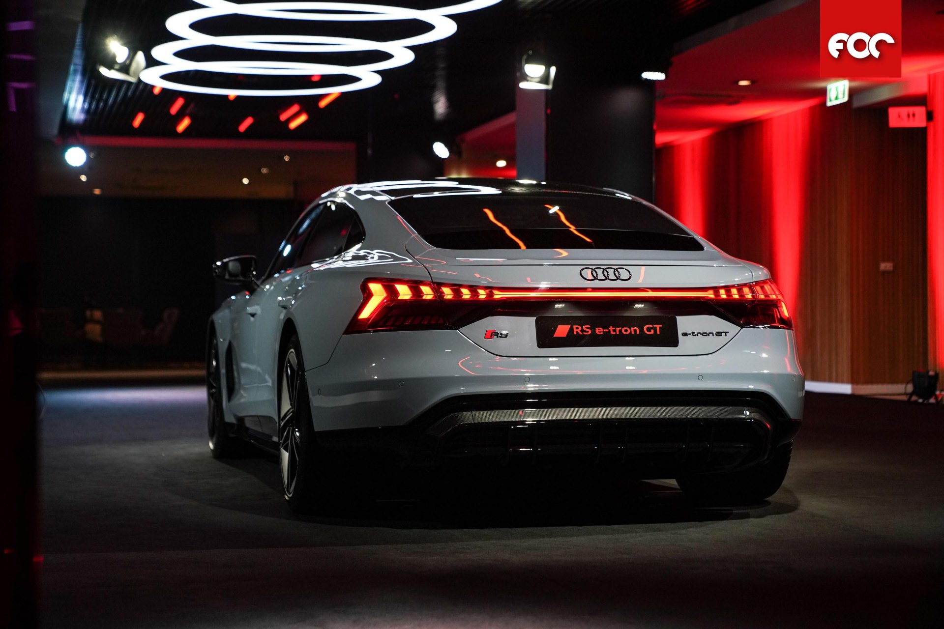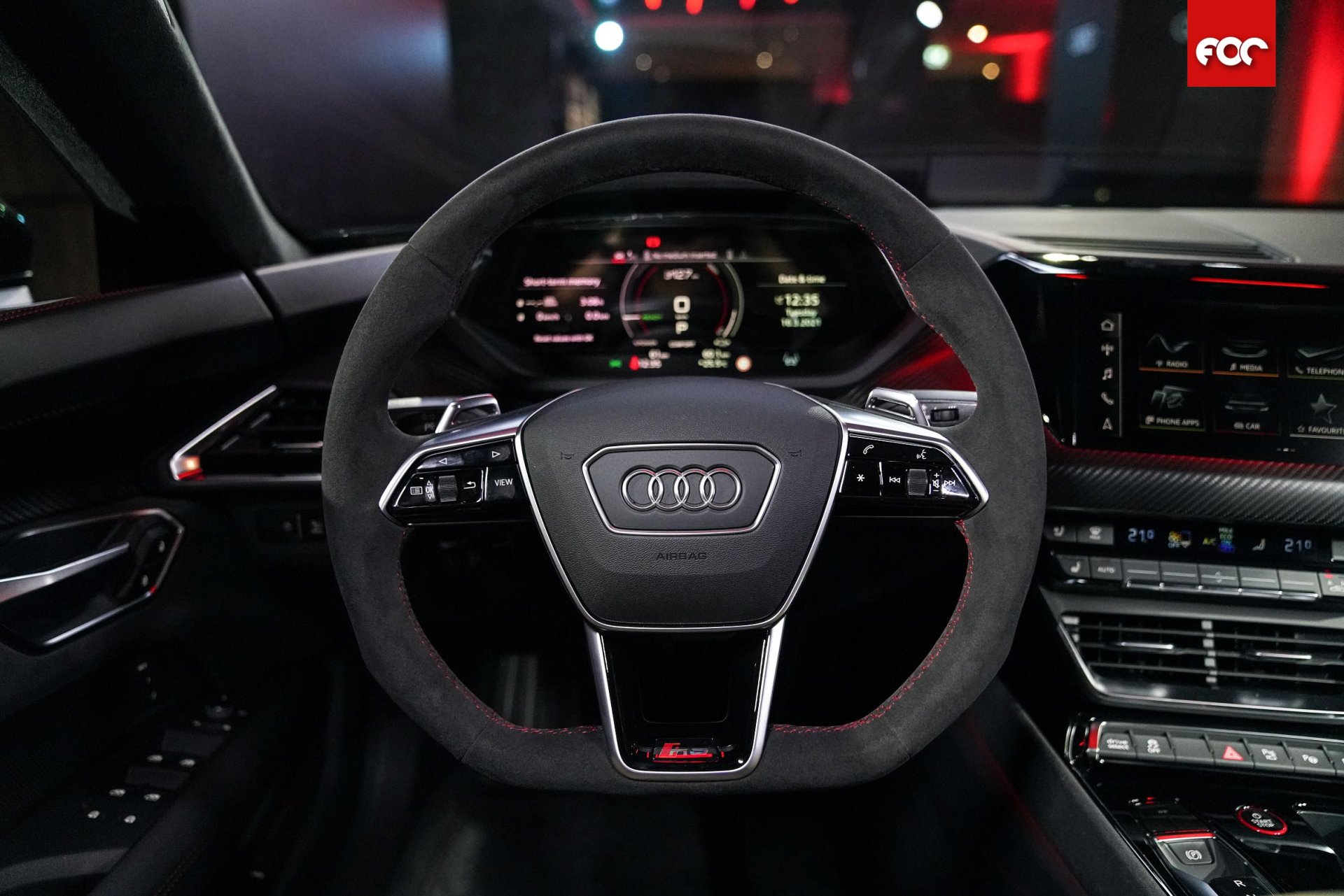 สำหรับตัวท็อป “Audi RS e-tron GT quattro” เป็นยนตรกรรมพลังงานไฟฟ้าที่มีความโดดเด่นด้านดีไซน์ โดยมีความสมบูรณ์แบบ สวยงาม โฉบเฉี่ยว สปอร์ตทั้งภายนอกและภายใน ด้วยอุปกรณ์อำนวยความสะดวกที่ผสมผสานดีไซน์ ฟังก์ชั่น และความสปอร์ตได้อย่างลงตัว มาพร้อมระบบควบคุมการขับเคลื่อนมอเตอร์ไฟฟ้า 2 ตำแหน่ง ให้พละกำลังสูงถึง 646 แรงม้า ใน Boost Mode แรงบิดสูงสุด 830 นิวตันเมตร อัตราเร่ง 0-100 กม./ชม. เพียง 3.3 วินาที ใน Boost Mode ความเร็วสูงสุด 250 กม./ชม. สามารถขับได้ไกลถึง 504 กิโลเมตรต่อการชาร์จหนึ่งครั้ง (ทดสอบตามมาตรฐาน NEDC) นอกจากนี้ Audi RS e-tron GT quattro ยังติดตั้งพวงมาลัยไฟฟ้าแบบ All-wheel steering เพิ่มความคล่องตัวในการขับขี่ในเมืองและการทรงตัวขณะเข้าโค้งด้วยความเร็ว พื้นที่เก็บสัมภาระกว้างขวาง โดยด้านหน้าความจุ 85 ลิตร ด้านหลัง 350 ลิตร ล้อ 21 นิ้ว ลายพิเศษ ดิสก์เบรกหน้า-หลังเคลือบทังสเตนคาร์ไบด์ (Tungsten Carbide) พร้อมคาลิเปอร์เบรกสีแดง ชุดตกแต่งภายนอกแบบ Black package พร้อมตกแต่งกระจกมองข้างด้วยสีดำ และตกแต่งกระจังหน้าด้วยสี Glossy black