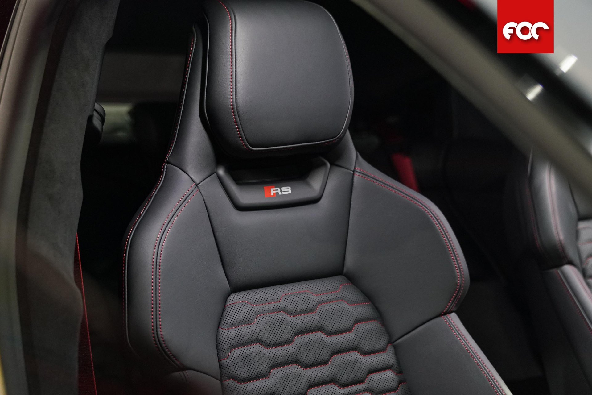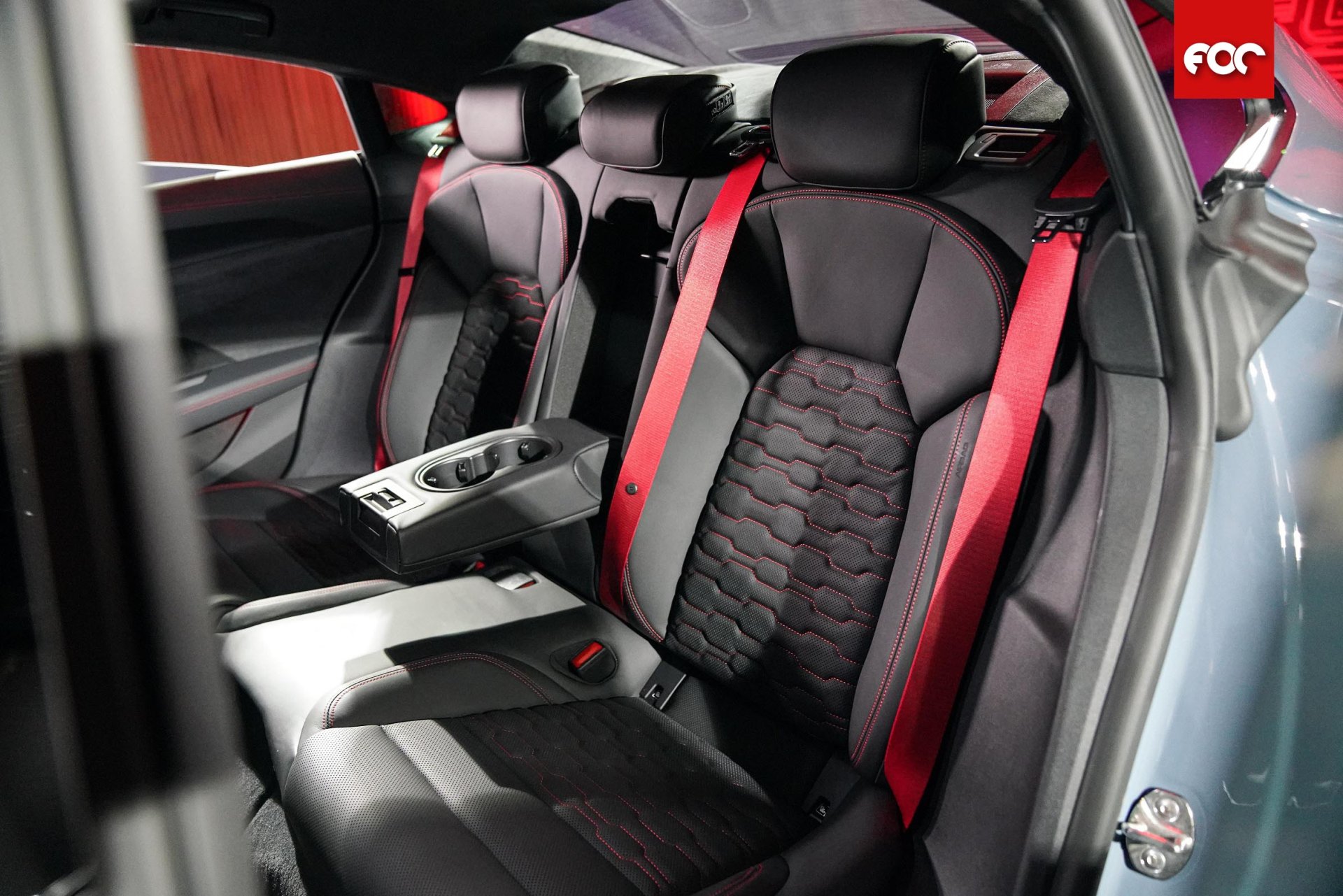 Audi RS e-tron GT quattro ได้รับการออกแบบภายในตามแบบฉบับของ Audi Sport ที่มีการจัดวางตำแหน่งที่นั่งภายในห้องโดยสารอันชาญฉลาด ส่งผลให้พื้นที่ในห้องโดยสารกว้างขวางและนั่งได้อย่างสะดวกสบาย ห้องโดยสารตกแต่งด้วยลาย Matte Carbon Twill ด้านข้างของคอนโซลตรงกลางหุ้มหนัง Alcantara สีดำตกแต่งด้วยด้ายสีแดง ทำให้ดูสวยดุดัน และสปอร์ตเพิ่มขึ้น ที่วางแขนข้างประตูหุ้มหนัง Fine Nappa ตกแต่งด้วยด้ายสีแดง เอกลักษณ์โดดเด่นแสดงให้เห็นความสปอร์ตด้วยสายเข็มขัดนิรภัยสีแดงล้วน พรมในห้องโดยสารด้านหน้าสีดำตกแต่งด้วยด้ายสีแดง เบาะนั่งคู่หน้าแบบ Sports Pro ตกแต่งแบบ Honeycomb พร้อมฟังก์ชั่นระบายอากาศ และนวดเพื่อการผ่อนคลาย สำหรับเบาะนั่งคู่หน้า พวงมาลัยไฟฟ้ามัลติฟังก์ชั่นทรงสปอร์ตท้ายตัดหุ้มหนัง Alcantara พร้อมสัญลักษณ์ RS เพิ่มความสะดวกสบายให้ผู้ขับขี่ด้วยระบบแสดงข้อมูล Head-up display ภายในที่กว้างขวางตามแบบฉบับของ Audi Sport เต็มเปี่ยมด้วยประสิทธิภาพอันทรงพลัง และสมรรถนะอันเร้าใจ พร้อมความสะดวกสบายตอบโจทย์การใช้งานในชีวิตประจำวัน