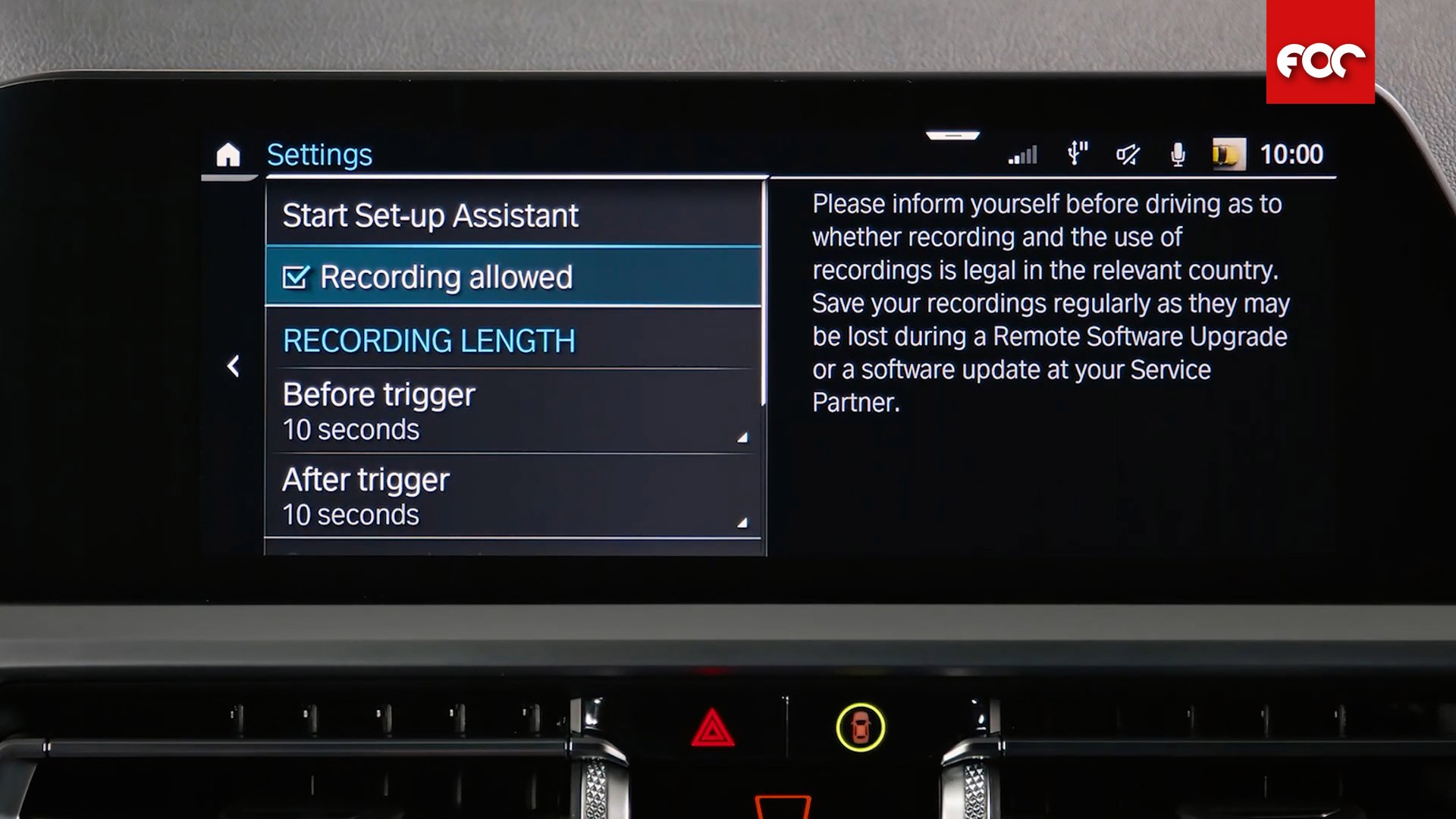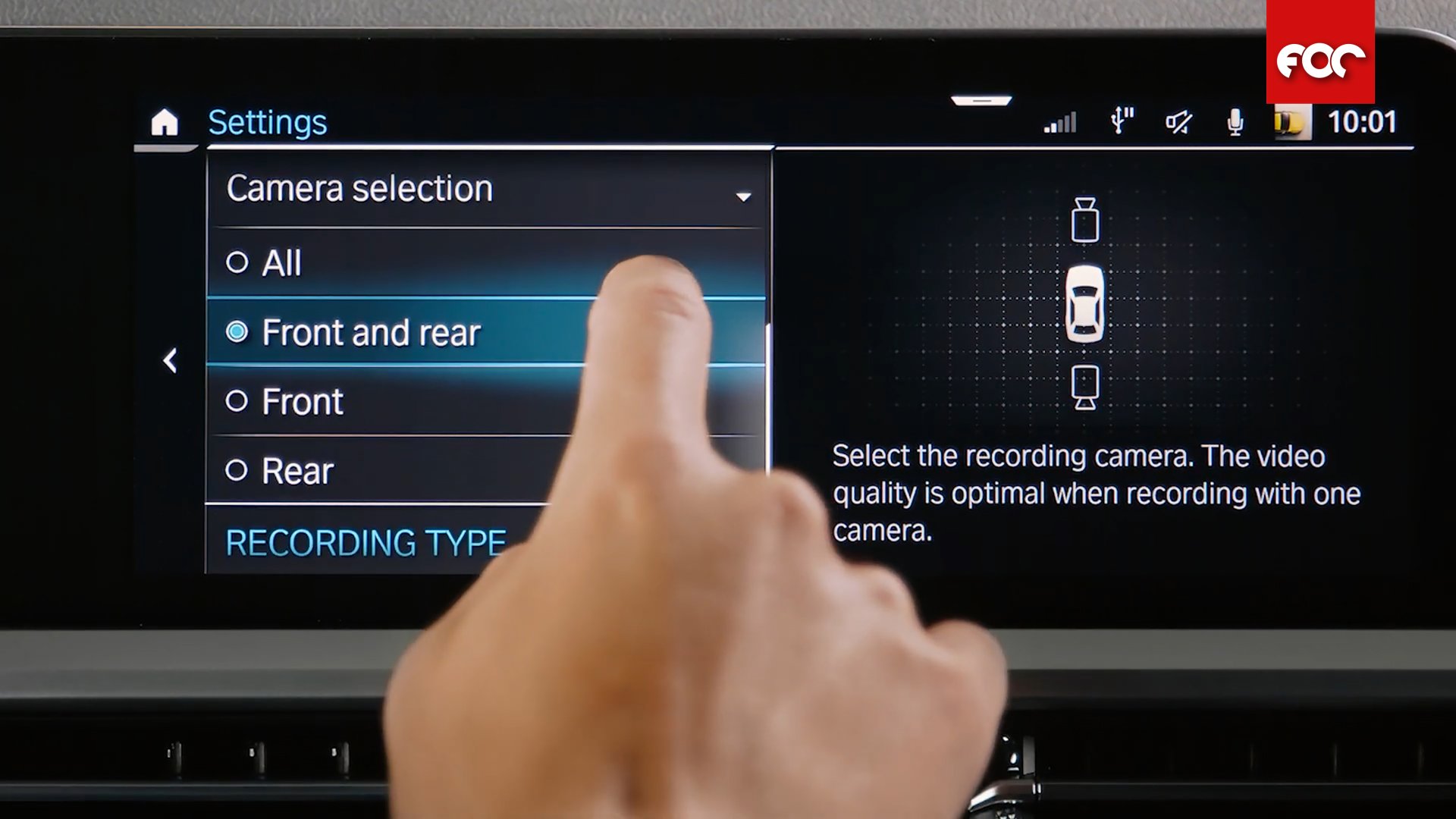 นอกจากการเลือกบันทึกภาพด้วยตนเองหรืออัตโนมัติแล้ว ระบบ BMW Drive Recorder ยังรองรับการตั้งค่าที่หลากหลายตามความต้องการเฉพาะตัวของผู้ขับขี่ ไม่ว่าจะเป็นการตั้งระยะเวลาในการบันทึกภาพ หรือการเลือกมุมกล้อง โดย BMW Drive Recorder สามารถบันทึกวิดีโอได้นานสูงสุด 40 วินาที มาพร้อมตัวเลือกในการตั้งระยะเวลาที่ระบบจะเริ่มบันทึกภาพในช่วงก่อนและหลังเกิดอุบัติเหตุ เริ่มตั้งแต่ 5 วินาทีไปจนถึง 20 วินาที ซึ่งระบบจะบันทึกเฉพาะภาพวีดีโอ แต่ไม่มีการบันทึกเสียง และผู้ขับขี่ยังสามารถเลือกกล้องที่จะใช้ในการบันทึกภาพได้ตามต้องการ ได้แก่ กล้องทั้ง 4 ตัว กล้องหน้าและกล้องหลัง และ กล้องหน้าหรือกล้องหลัง ซึ่งระบบจะจัดเก็บคลิปวิดีโอได้สูงสุดถึง 10 คลิปในระบบ iDrive และสามารถเรียกดูหรือลบวีดีโอในภายหลังได้ทางจอ Control Display หรือบันทึกลงอุปกรณ์จัดเก็บข้อมูล USB นอกจากนี้ ผู้ขับขี่ยังจะได้รับการแจ้งเตือนทุกครั้งที่ระบบเริ่มบันทึกภาพ และสามารถเลือกปิดการใช้งานระบบ Drive Recorder ได้เช่นกัน โดยก่อนเริ่มใช้งานระบบ Drive Recorder ผู้ขับขี่จะต้องยอมรับข้อกำหนดและเงื่อนไขการปฏิเสธความรับผิดชอบตามกฎหมาย และจะเปิดใช้งานระบบได้ขณะสตาร์ทเครื่องยนต์อยู่เท่านั้น