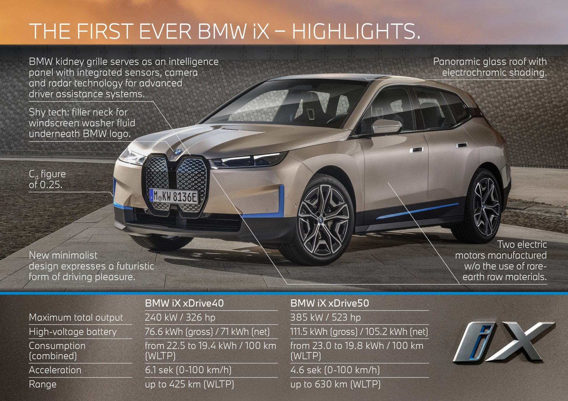 บีเอ็มดับเบิลยู iX จะเปิดตัวสู่ตลาดเป็นครั้งแรกด้วยสองรุ่นย่อย ซึ่งมาพร้อมระบบการขับเคลื่อนสี่ล้อแบบไฟฟ้า สำหรับบีเอ็มดับเบิลยู iX xDrive50 ส่งพละกำลังรวมสูงสุด 385 กิโลวัตต์/523 แรงม้า (อัตราการใช้ไฟฟ้าตามมาตรฐาน WLTP อยู่ที่ 23.0 – 19.8 กิโลวัตต์ชั่วโมง/100 กิโลเมตร ระดับการปล่อย CO2 เฉลี่ย 0 กรัม/กิโลเมตร) และสำหรับบีเอ็มดับเบิลยู iX xDrive40 ส่งพละกำลังสูงสุด 240 กิโลวัตต์/326 แรงม้า (อัตราการใช้ไฟฟ้าตามมาตรฐาน WLTP อยู่ที่ 22.5 – 19.4 กิโลวัตต์ชั่วโมง/100 กิโลเมตร ระดับการปล่อย CO2 เฉลี่ย 0 กรัม/กิโลเมตร) ประสิทธิภาพของระบบขับเคลื่อนเมื่อทำงานควบคู่กับเทคโนโลยีเซลล์แบตเตอรี่ใหม่ล่าสุด มอบระยะทางขับเคลื่อนตามมาตรฐาน WLTP สูงสุดถึง 630 กิโลเมตร สำหรับบีเอ็มดับเบิลยู iX xDrive50 และ 425 กิโลเมตร สำหรับบีเอ็มดับเบิลยู iX xDrive40 นอกจากนี้ บีเอ็มดับเบิลยู กรุ๊ป ยังเตรียมเปิดตัวบีเอ็มดับเบิลยู iX M60 มาร่วมไลน์อัพ (อัตราการใช้ไฟฟ้าตามมาตรฐาน WLTP อยู่ที่ 21.6 กิโลวัตต์ชั่วโมง/100 กิโลเมตร ระดับการปล่อย CO2 เฉลี่ย 0 กรัม/กิโลเมตร) เพื่อมอบขุมพลังสูงสุดถึง 440 กิโลวัตต์/600 แรงม้า ที่พร้อมสร้างประสบการณ์ขับขี่ด้วยพลังงานไฟฟ้าแบบสปอร์ตเร้าใจอย่างเต็มพิกัด (ข้อมูลการส่งกำลังของมอเตอร์และอัตราการใช้ไฟฟ้าของบีเอ็มดับเบิลยู iX M60 เป็นการคาดการณ์โดยใช้ข้อมูลของรถยนต์ซึ่งยังอยู่ในขั้นตอนการพัฒนา)