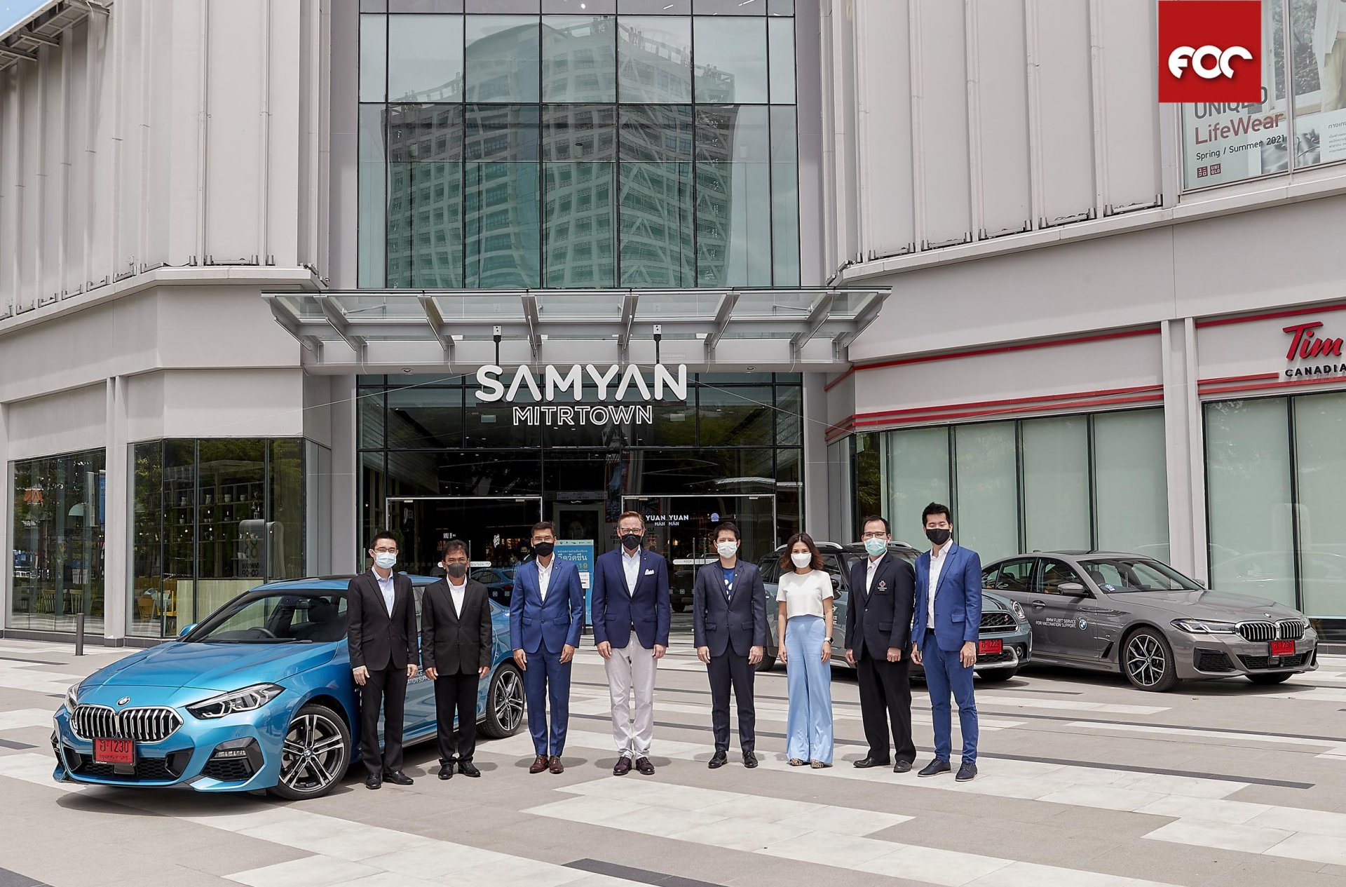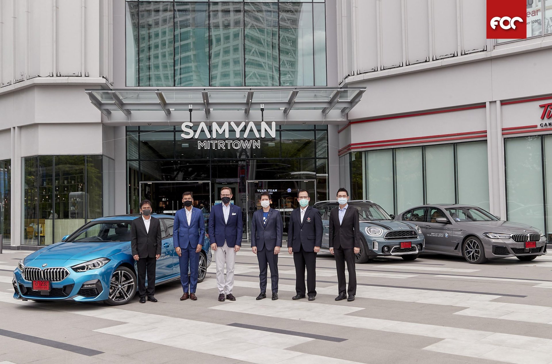 บีเอ็มดับเบิลยู กรุ๊ป ประเทศไทย นำโดย มร.อเล็กซานเดอร์ บารากา (ที่ 3 จากซ้าย) ประธาน ร่วมกับบริษัท ฮ้อปคาร์ จำกัด นำโดย คุณกฤษฏิ์ วิชัยวัฒนาพาณิชย์ (ที่ 4 จากซ้าย) ประธานกรรมการบริหารและผู้ก่อตั้ง ร่วมกันนำเสนอทางเลือกเพื่ออำนวยความสะดวกด้านการเดินทางและปฏิบัติงานแก่บุคลากรทางการแพทย์และผู้ที่เดินทางไปฉีดวัคซีน