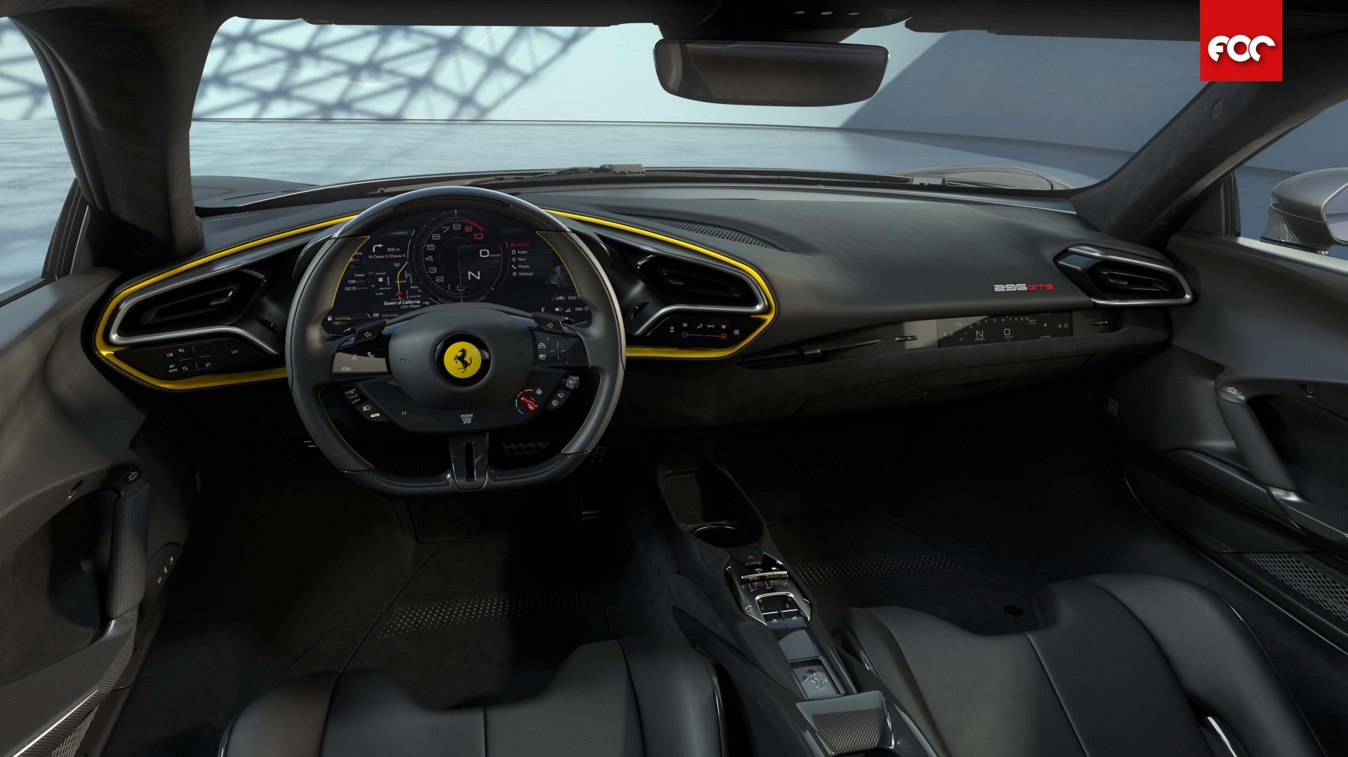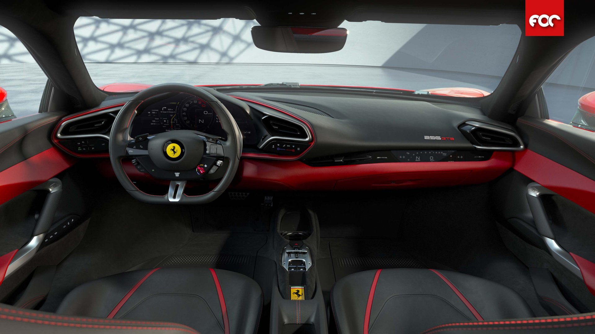 ห้องโดยสารของ 296 GTB ถูกพัฒนาขึ้นภายใต้แนวคิดแห่งอินเตอร์เฟซดิจิตอลเต็มรูปแบบซึ่งเฟอร์รารี่ได้เปิดตัวครั้งแรกใน SF90 Stradale เลย์เอาท์ของห้องโดยสารนี้รังสรรค์ขึ้นให้มีรูปแบบที่สอดคล้องกับ SF90 ในขณะที่ผู้ออกแบบ SF90 Stradale ต้องการเน้นย้ำถึงเทคโนโลยีขั้นสูงและความแตกต่างที่ชัดเจนจากอดีต; ในกรณีของ 296 GTB แนวคิดคือการทำให้เทคโนโลยีนั้นสมบูรณ์แบบ ผลลัพธ์ที่ได้คือความบริสุทธิ์และเรียบง่าย โดดเด่นด้วยความสง่างามอันทรงพลังที่สะท้อนการออกแบบภายนอกได้อย่างสมบูรณ์แบบ