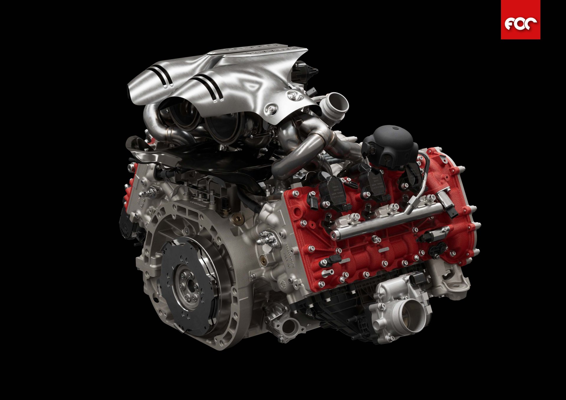 เครื่องยนต์ตัวนี้นำข้อดีจากการพัฒนาห้องเผาไหม้แบบล่าสุดของเฟอร์รารี่ที่เปิดตัวครั้งแรกใน SF90 Stradale มาใช้: หัวฉีดและหัวเทียน ร่วมด้วยระบบจ่ายเชื้อเพลิงแรงดันสูง 350 บาร์ ทช่วยเพิ่มประสิทธิภาพการผสมน้ำมันกับอากาศในห้องเผาไหม้เพิ่ม, สมรรถนะ และลดมลพิษ ท่อร่วมไอดีและไอเสียถูกออกแบบและปรับแต่งเพื่อเพิ่มประสิทธิภาพเชิงปริมาตร ทั้งยังรับประกันว่าจะได้อากาศหมุนวนระดับสูงในห้องเผาไหม้