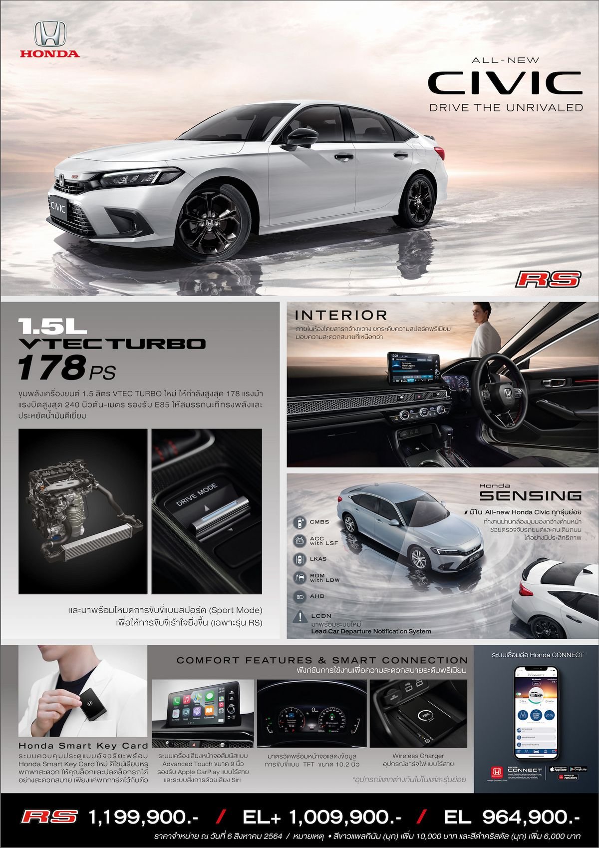 พร้อมแล้วที่จะสร้างมาตรฐานใหม่ให้กับวงการยานยนต์อีกครั้ง ด้วยดีไซน์ภายนอกสปอร์ตพรีเมียมในทุกมุมมอง เสริมความโฉบเฉี่ยวเร้าใจด้วยรุ่น RS ดีไซน์สุดเอกซ์คลูซีฟสไตล์สปอร์ตที่ตกแต่งพิเศษด้วยโทนสีดำรอบคัน พร้อมปลอกท่อไอเสียคู่ ภายในห้องโดยสารกว้างขวางสะดวกสบาย พร้อมโหมดการขับขี่ที่เลือกได้ถึง 3 โหมด นอกจากนี้ ในทุกรุ่นย่อย ให้ความแรงทรงพลังเร้าใจเกินใคร ด้วยเครื่องยนต์ VTEC TURBO 1.5 ลิตร ใหม่ พร้อมระบบเกียร์ CVT ให้กำลังสูงสุด 178 แรงม้า ให้อัตราการประหยัดน้ำมันดีเยี่ยม 17.2 กม./ลิตร ทั้งยังรองรับพลังงานทางเลือก E85 และมาพร้อมเทคโนโลยีความปลอดภัยอัจฉริยะ ฮอนด้า เซนส์ซิ่ง (Honda SENSING) ที่ยกระดับไปอีกขั้นกับระบบใหม่ Lead Car Departure Notification System (LCDN) สะดวกสบายแบบเหนือกว่ากับครั้งแรกของระบบควบคุมประตูแบบอัจฉริยะพร้อม Honda Smart Key Card