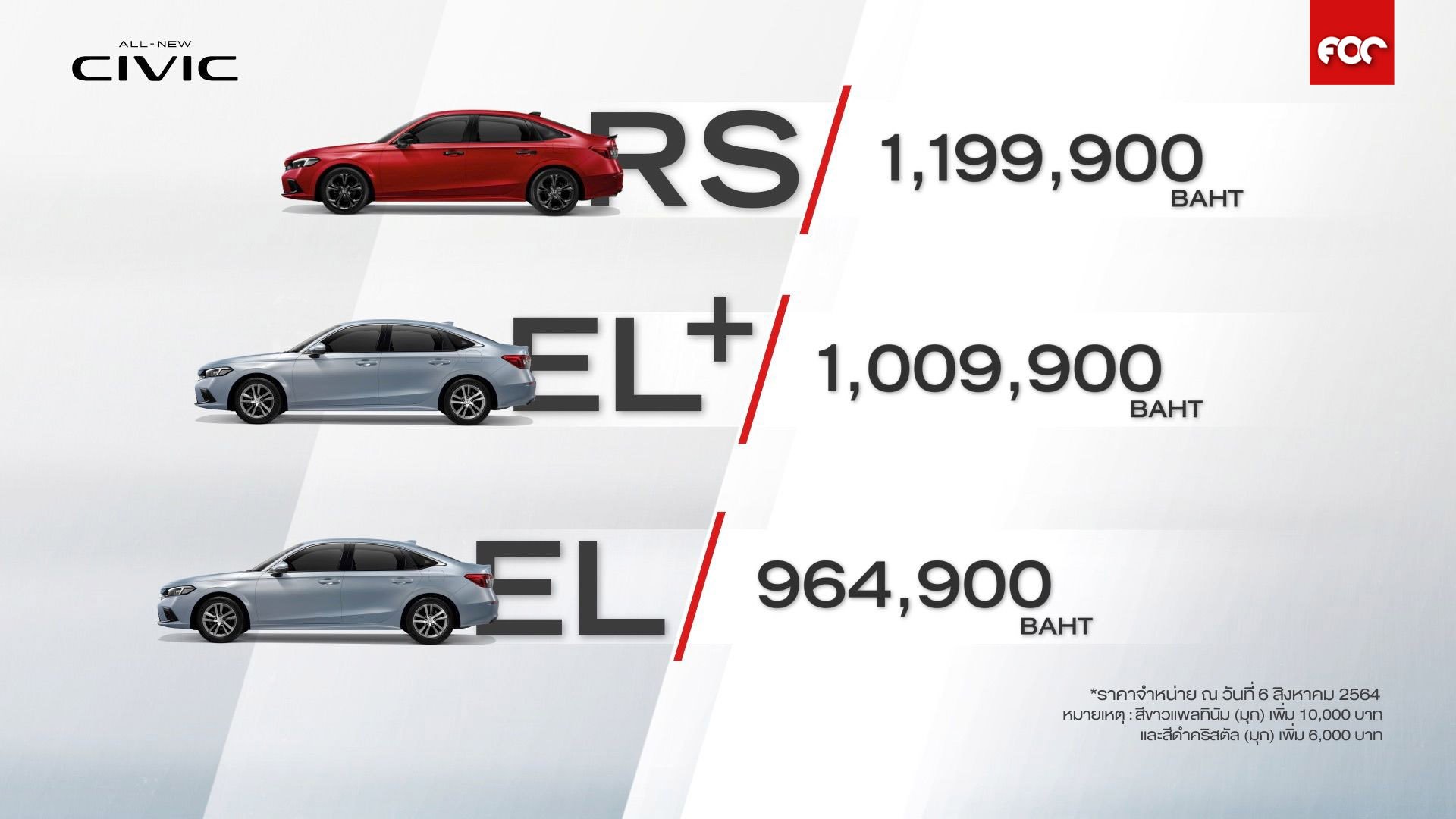 มาพร้อมข้อเสนอพิเศษเพื่อให้ลูกค้าเป็นเจ้าของ ฮอนด้า ซีวิค ใหม่ ได้ง่ายขึ้นกับ ดอกเบี้ย 2.99% พร้อมฟรีประกันภัย 1 ปี และบัตรเติมน้ำมันมูลค่า 5,000 บาท เมื่อจองและรับรถตั้งแต่วันที่ 6 สิงหาคม 2564 - 31 สิงหาคม 2564
