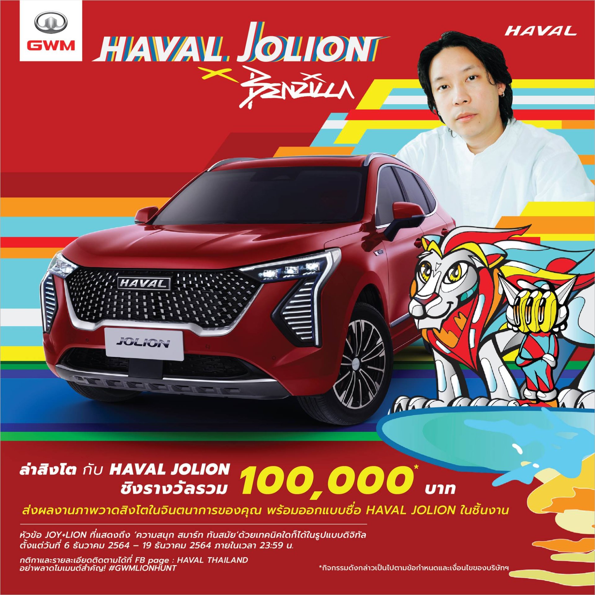 เกรท วอลล์ มอเตอร์ จับมือ BENZILLA สตรีทอาร์ททิสชื่อดัง ชวนคนไทยปลดปล่อยความคิดสร้างสรรค์ไปกับกิจกรรม “ล่าสิงโต กับ HAVAL JOLION” ชวนวาดภาพสิงโตภายใต้คอนเซ็ปต์ JOY+LION ที่ได้รับแรงบันดาลใจมาจากรถยนต์ All New HAVAL JOLION Hybrid SUV พร้อมแชร์ผลงานในโซเชี่ยลมีเดียและเพจ HAVAL Thailand ในระหว่างวันที่ 6 – 19 ธันวาคม พ.ศ.2564 เพื่อลุ้นรับเงินรางวัลรวมมูลค่า 100,000 บาท