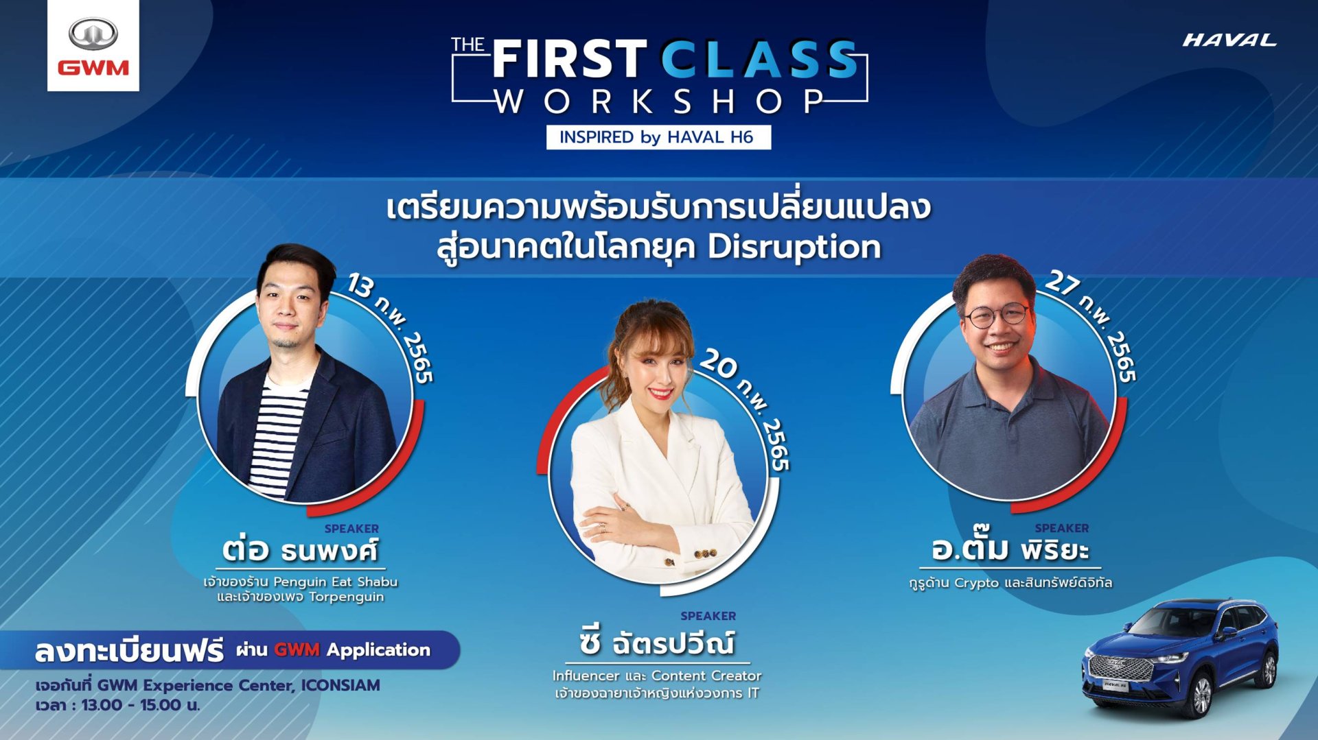 เกรท วอลล์ มอเตอร์ ตอกย้ำวิสัยทัศน์ความเป็นผู้นำด้านยานยนต์ไฟฟ้าที่ขับเคลื่อนด้วยนวัตกรรมและเทคโลยีล้ำสมัย พร้อมเดินหน้านำเสนอองค์ความรู้และสิ่งใหม่ๆ ให้กับสังคมไทยอย่างต่อเนื่อง จัดกิจกรรม ‘THE FIRST CLASS WORKSHOP INSPIRED BY HAVAL H6’ ชวนลูกค้าและผู้บริโภคที่สนใจร่วมก้าวไปสู่ความเป็นที่ 1 ภายใต้การนำเสนอสุดยอดวิสัยทัศน์และมุมมองต่างๆ ท่ามกลางยุคสมัยแห่งความเปลี่ยนแปลง สะท้อนเอกลักษณ์ของ All New HAVAL H6 Hybrid SUV รถยนต์เอสยูวีไฮบริดอัจฉริยะระดับโลกที่อัดแน่นด้วยเทคโนโลยี สมรรถนะ และมาตรฐานความปลอดภัยแห่งอนาคต ผ่านการจัดเวิร์คช็อปโดย 3 วิทยากรชื่อดัง ได้แก่ คุณต่อ-ธนพงศ์ วงศ์ชินศรี ผู้ร่วมก่อตั้งร้าน “Penguin Eat Shabu” และเจ้าของเพจ Torpenguin คุณซี-ฉัตรปวีณ์ ตรีชัชวาลวงศ์ เจ้าของฉายาเจ้าหญิงแห่งวงการไอที และอาจารย์ตั๊มพิริยะ สัมพันธารักษ์ กรรมการสมาคมสินทรัพย์ดิจิทัลไทย และกรรมการผู้จัดการบริษัท โฉลกดอทคอม จำกัด กูรูด้าน Bitcoin และ Cryptocurrency ระดับแนวหน้าของไทย ในวันอาทิตย์ที่ 13, 20 และ 27 กุมภาพันธ์ 2565 เวลา 13.00 – 15.00 น. ณ GWM Experience Center ไอคอนสยาม และการถ่ายทอดสดผ่านช่องทางออนไลน์ เฟสบุ๊กแฟนเพจ HAVAL THAILAND ตามวันและเวลาดังกล่าว
