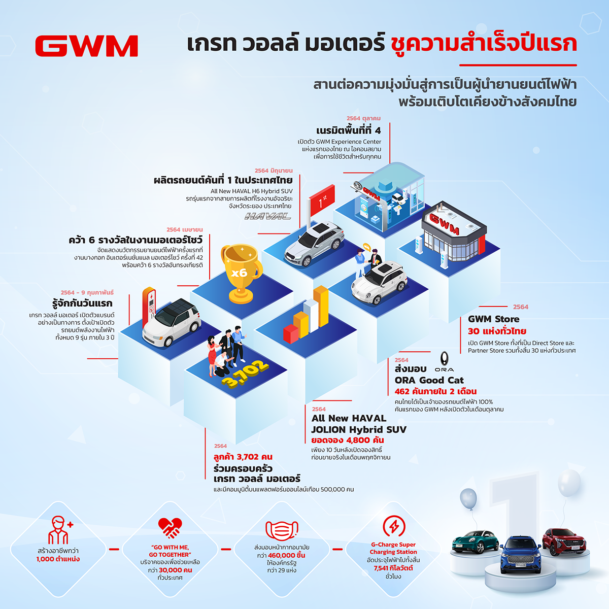 ในโอกาสนี้ เกรท วอลล์ มอเตอร์ ได้รวบรวมตัวเลขและสรุปเหตุการณ์สำคัญในปี 2564 ที่ไม่เพียงเป็นเครื่องยืนยันความสำเร็จของการดำเนินธุรกิจในประเทศไทย เพื่อก้าวขึ้นสู่การเป็นผู้นำด้านรถยนต์พลังงานไฟฟ้าอย่างแข็งแกร่ง แต่ยังเสริมสร้างความใกล้ชิดระหว่างแบรนด์กับผู้บริโภคให้แน่นแฟ้นมากยิ่งขึ้น ดังนี้