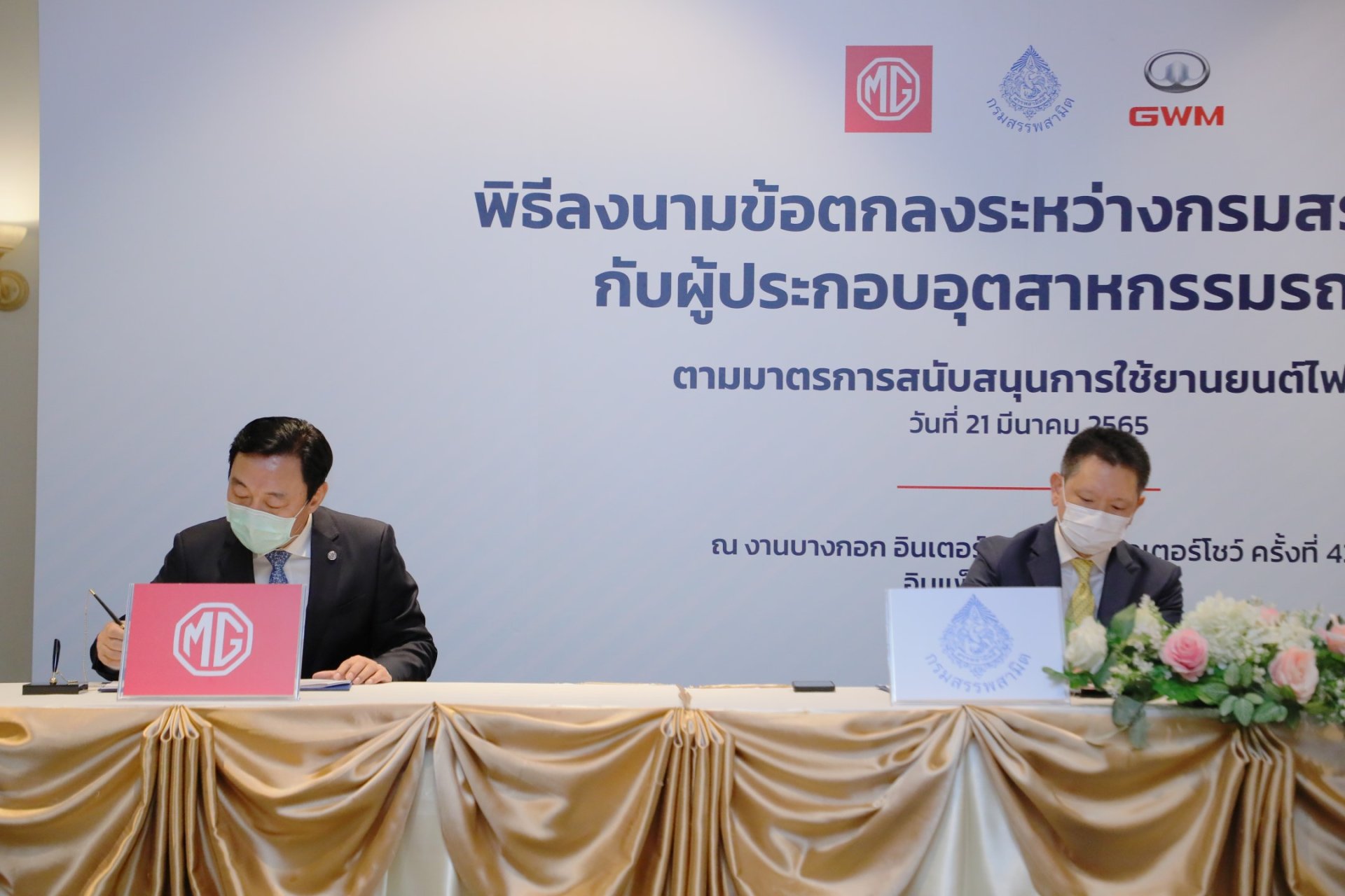 บริษัท เอสเอไอซี มอเตอร์ – ซีพี จำกัด และ บริษัท เอ็มจี เซลส์ (ประเทศไทย) จำกัด ผู้ผลิตและจำหน่ายรถยนต์เอ็มจีในประเทศไทย ในฐานะผู้บุกเบิกและผู้นำตลาดรถยนต์พลังงานไฟฟ้าในประเทศไทย ลงนามบันทึกข้อตกลงการขอรับสิทธิตามมาตรการสนับสนุนการใช้ยานยนต์ไฟฟ้ากับกรมสรรพสามิต โดยมี นายลวรณ แสงสนิท อธิบดีกรมสรรพสามิต (กลาง) และ มร. จาง ไห่โป กรรมการผู้จัดการบริษัท เอสเอไอซี มอเตอร์ – ซีพี จำกัด และ บริษัท เอ็มจี เซลส์ (ประเทศไทย) จำกัด (ซ้ายมือ) ร่วม พิธีลงนามข้อตกลงระหว่างกรมสรรพสามิตกับผู้ประกอบอุตสาหกรรมยานยนต์ตามมาตรการสนับสนุนการใช้ยานยนต์ไฟฟ้า ในงานบางกอก อินเตอร์เนชั่นแนล มอเตอร์โชว์ ครั้งที่ 43 อิมแพ็ค เมืองทองธานี