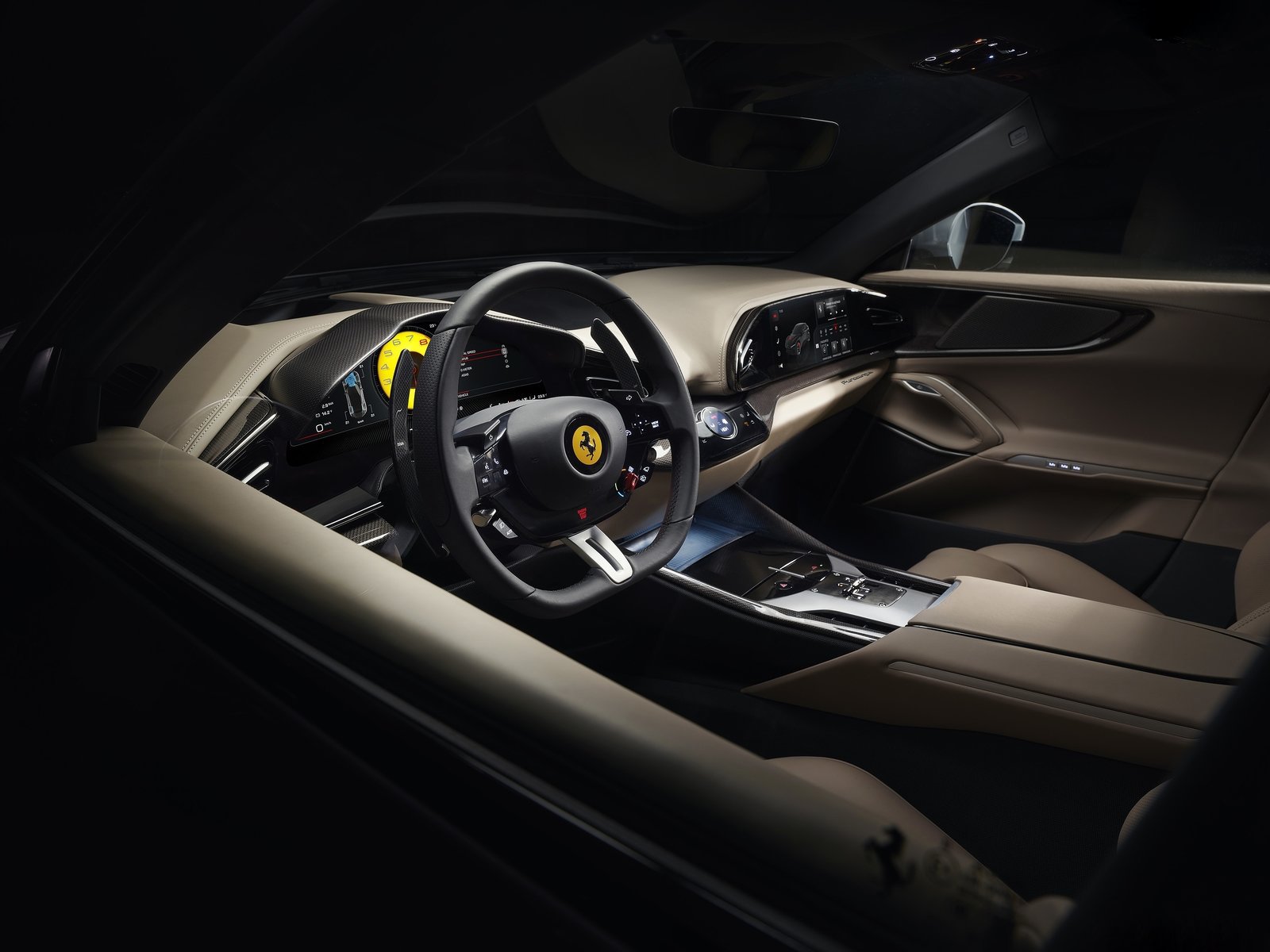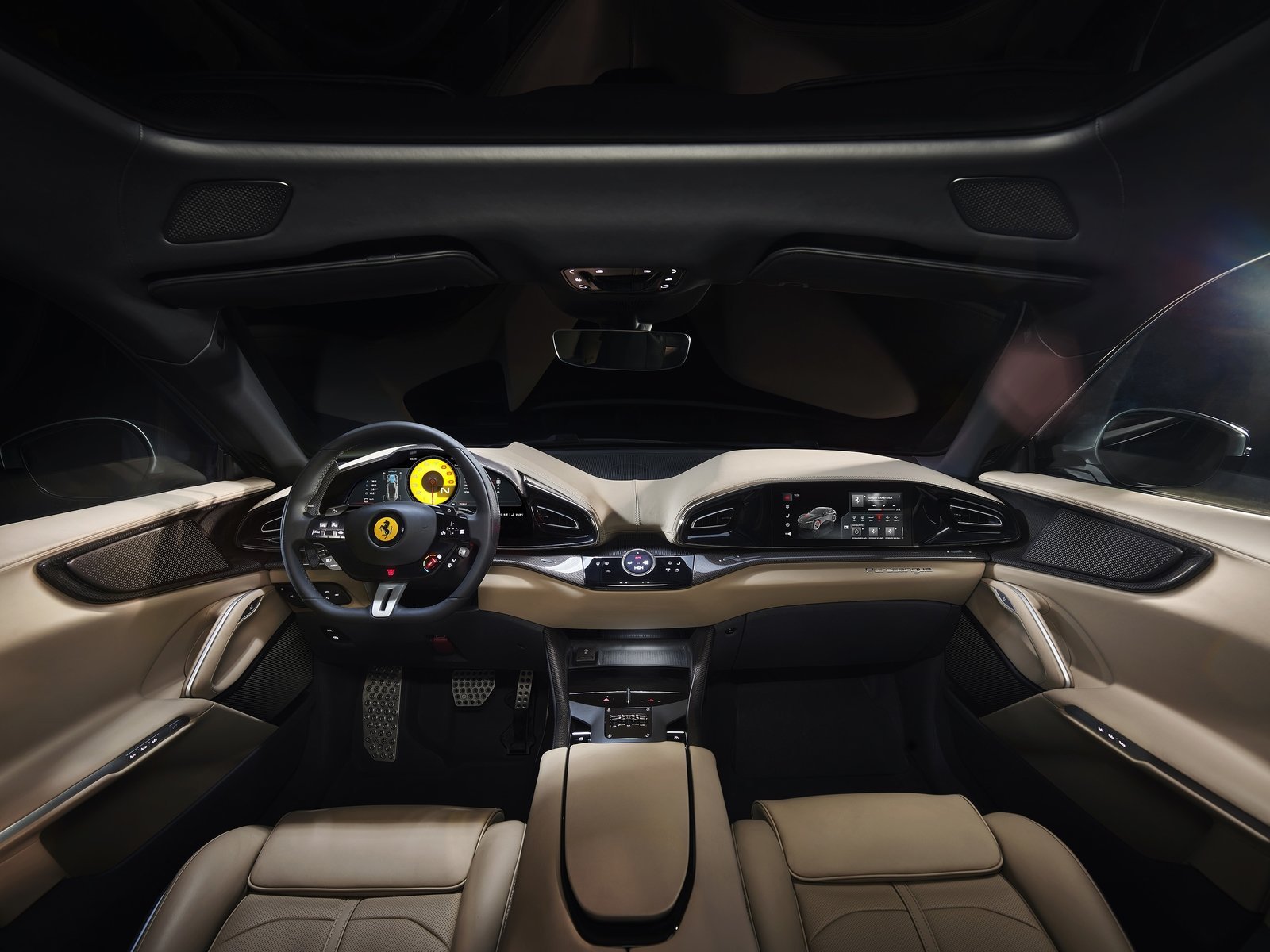 ภายในของ Purosangue ต้องการความพิถีพิถันในการออกแบบ ทั้งในส่วนของพื้นที่และการตกแต่ง ตลอดจนการเลือกใช้วัสดุอย่างเอาใจใส่เพื่อให้ได้มาซึ่งพื้นที่สำหรับผู้โดยสารในแบบที่ไม่เคยมีมาก่อน พร้อมความสะดวกสบายตามแบบฉบับของรถเฟอร์รารี่ 4 ที่นั่ง ห้องโดยสารให้ภาพลักษณ์และความรู้สึกราวกับห้องนั่งเล่นที่หรูหราและโฉบเฉี่ยวแบบสุดขั้ว เมื่อเปิดประตู จะเผยให้เห็นพื้นที่กว้างขวางจนน่าทึ่ง และที่น่าแปลกใจพอๆ กันก็คือ การตกแต่งภายในที่หรูหราล้ำสมัย จนรู้สึกได้ถึงความสง่างามและล้ำยุค ภาษาการออกแบบยุคใหม่ผสานเข้ากับสุนทรียะของรถสปอร์ต GT อันเป็นเอกลักษณ์ของเฟอร์รารี่ได้อย่างกลมกลืน รูปทรงทั้งหมดมีขนาดกะทัดรัดแต่มีเจตนาเพื่อเพิ่มทั้งพื้นที่ใช้สอยและสรีรศาสตร์ ค็อกพิทของผู้ขับได้รับแรงบันดาลใจมาจาก SF90 Stradale และฝั่งผู้โดยสารก็แทบจะเป็นดีไซน์แบบเดียวกัน สิ่งนี้ช่วยให้เกิดเป็นสัมผัสแห่งการมีส่วนร่วมต่อกันของผู้โดยสารเบาะหน้าอย่างที่ไม่มีใครเทียบเคียงได้ ร่วมด้วยจอแสดงผลขนาด 10.2 นิ้ว ที่แจ้งข้อมูลสำคัญทั้งหมดเพื่อเสริมให้เกิดความรู้สึกร่วมในประสบการณ์การขับขี่ Purosangue ติดตั้งอินเตอร์เฟซแบบดิจิตอลเต็มระบบมาให้เป็นอุปกรณ์มาตรฐานสำหรับในทุกเรนจ์
