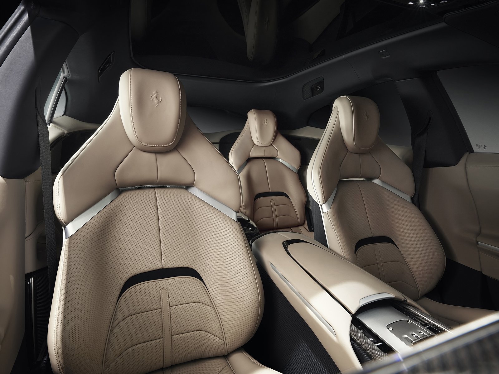 นับเป็นครั้งแรกในประวัติศาสตร์ของเฟอร์รารี่ที่ใช้เบาะแบบปรับด้วยไฟฟ้าที่ติดตั้งแยกอิสระต่อกันทั้ง 4 ตัว การผสมผสานส่วนประกอบที่เน้นความสบาย, การใช้โฟมที่ปรับความหนาแน่นได้ และระบบกันสะเทือนใหม่ หมายความว่า Purosangue จะมอบความสะดวกสบายให้แก่ผู้โดยสารในแบบที่ไม่เคยมีมาก่อน พร้อมเลย์เอาต์ที่แสดงถึงความสปอร์ตและสง่างามตามแบบฉบับของภาษาการออกแบบจากเฟอร์รารี่ พนักพิงแบบทำความร้อนได้สามารถปรับและเอนได้อย่างอิสระ และหากเลื่อนไปข้างหน้าจนสุด จะช่วยเพิ่มความจุสัมภาระของ Purosangue ได้อย่างมาก การแสวงหาหนทางสู่ความหรูหราของเฟอร์รารี่ ไม่ได้ละเลยแม้เพียงวินาทีต่อความรับผิดชอบกับสิ่งแวดล้อมและการใช้ประโยชน์อย่างยั่งยืน วัสดุที่ยั่งยืนถูกนำมาใช้ในห้องโดยสารของ Purosangue ทั่วทั้งคัน จึงเปิดโอกาสให้สามารถผสมผสานรูปแบบใหม่ๆ เข้าไปได้ ข้อเท็จจริงก็คือ 85 เปอร์เซ็นต์ ของการตกแต่งในรถคันนี้ใช้วัสดุที่มีความยั่งยืนทั้งสิ้น ผ้าบุหลังคาผลิตจากโพลีเอสเตอร์รีไซเคิล, พรมจากโพลีอารามิดซึ่งรีไซเคิลมาจากอวนที่เก็บได้จากทะเล และหนัง Alcantara® สูตรใหม่ ที่ทำมาจากโพลีเอสเตอร์รีไซเคิลเช่นกัน โดย Purosangue นับเป็นรถคันแรกๆ ของโลกที่ใช้หนัง Alcantara® รุ่นพิเศษซึ่ง 68 เปอร์เซ็นต์ ทำจากโพลีเอสเตอร์รีไซเคิล สำหรับ Alcantara® รุ่นนี้ ได้รับมาตรฐานจาก Recycled Claimed Standard (RCS) ซึ่งรับรองโดย ICEA เป็นมาตรฐานสากลชั้นนำที่ตรวจสอบยืนยันวัสดุรีไซเคิลและติดตามวัสดุจากแหล่งกำเนิดไปยังผลิตภัณฑ์ขั้นสุดท้ายได้