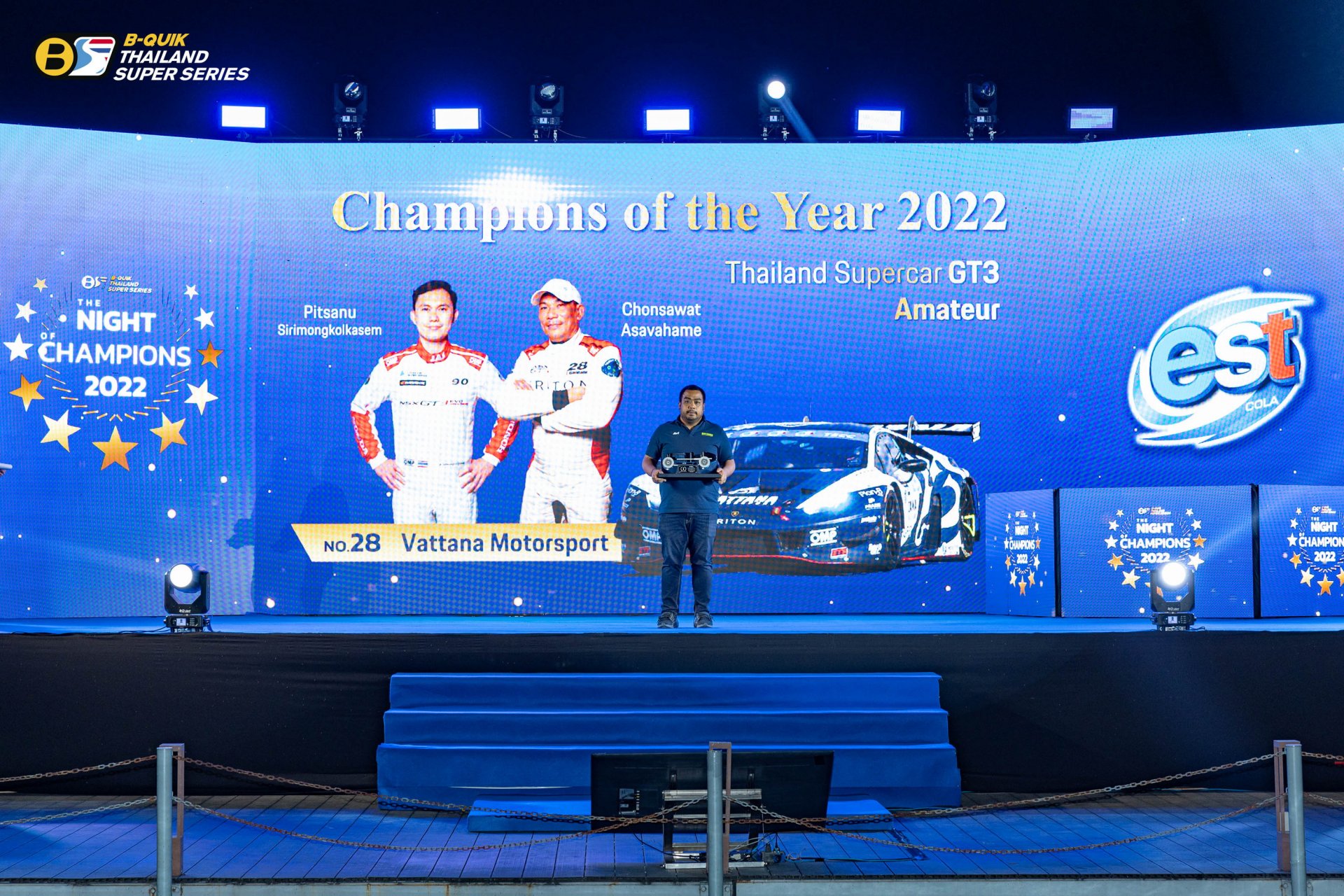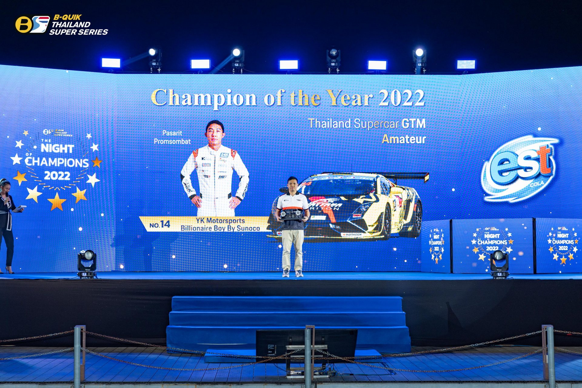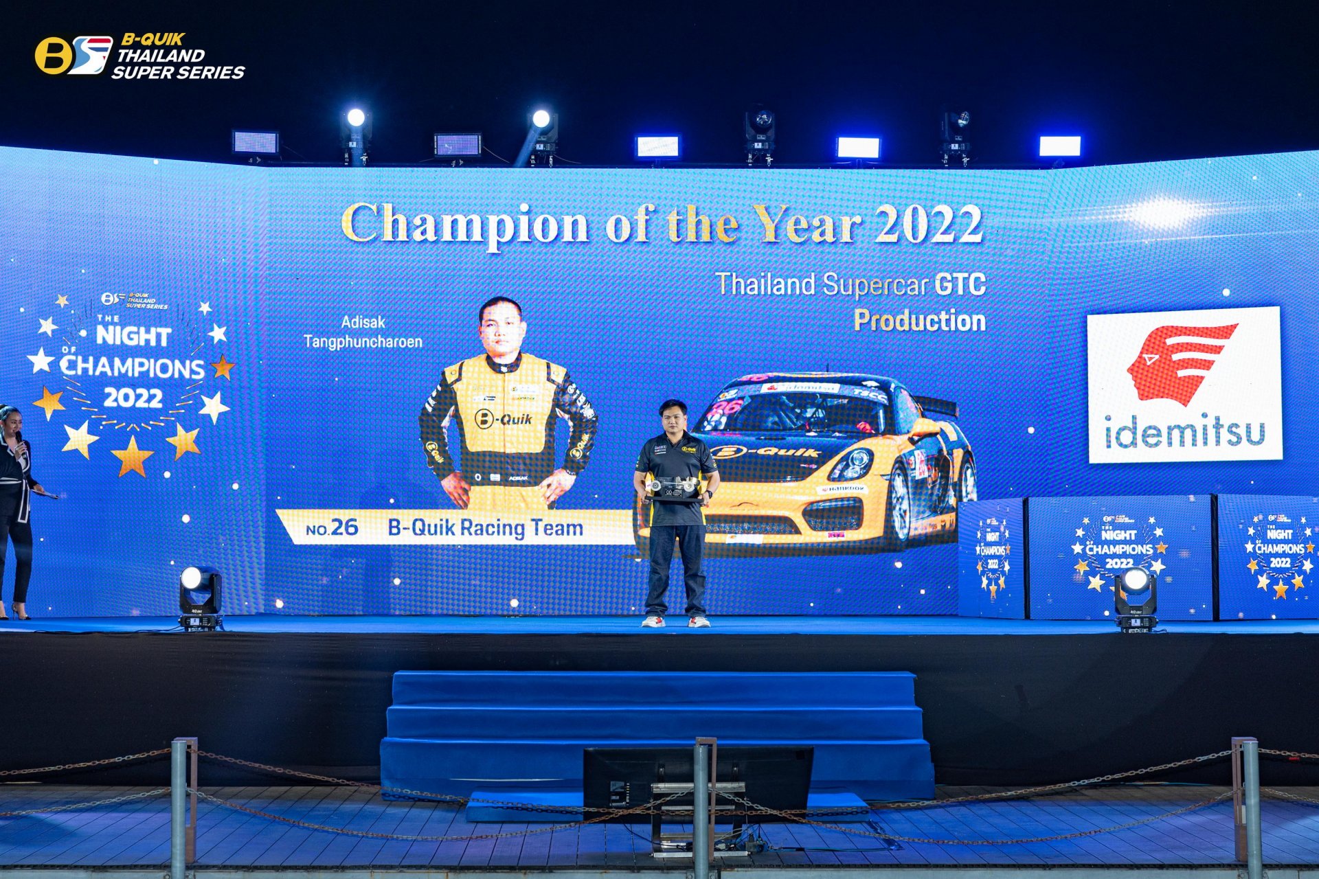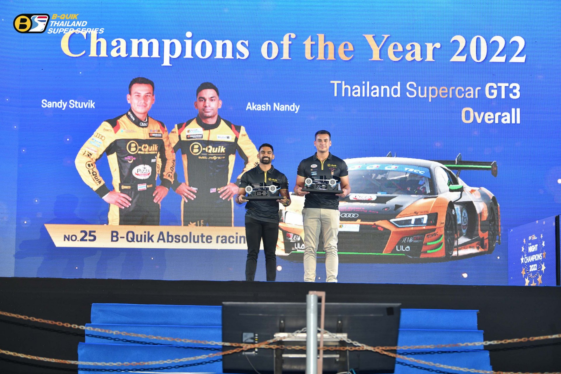 บริษัท เรซซิ่ง สปิริต จํากัด ผู้ดําเนินการจัดการแข่งขันรถยนต์ทางเรียบภายใต้ชื่อรายการ “B-Quik Thailand Super Series 2022” จัดงานใหญ่ The Night of Champions 2022 ส่งท้ายฤดูกาล พร้อมประกาศผลรางวัลอันทรงเกียรติ โดยมีคุณสนธยา คุณปลื้ม ประธานจัดการแข่งขัน B-Quik Thailand Super Series ขึ้นเป็นประธานในพิธี