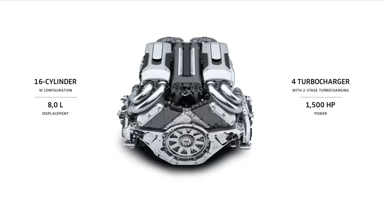 ขุมพลัง W16 8 ลิตร 4สูบเทอร์โบ 1,500 แรงม้า แรงบิด 1,600 Nm ที่ 2,000-6,000 รอบ/นาที พร้อมอัตราทดเกียร์ที่สั้นลงกว่า Chiron Sport 15% เร่ง 0-100 กม./ชม. ใน 2.3 วินาที, 0-200 กม./ชม. ใน 5.5 วินาที และท๊อปสปีดยังปรับเพิ่มขึ้นเป็น 380 กม./ชม.