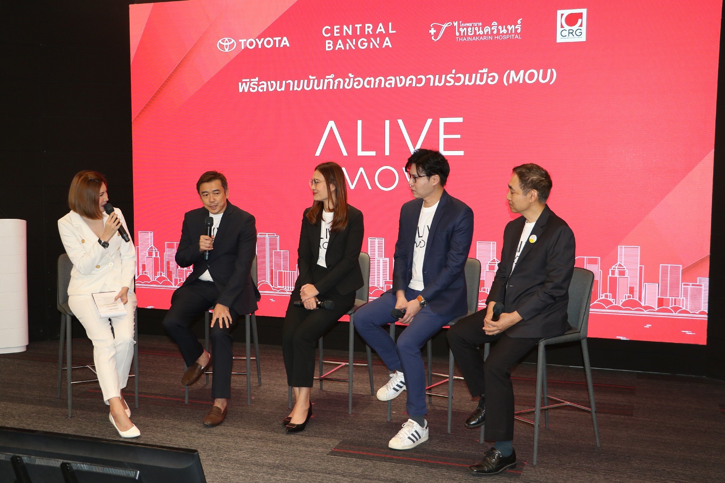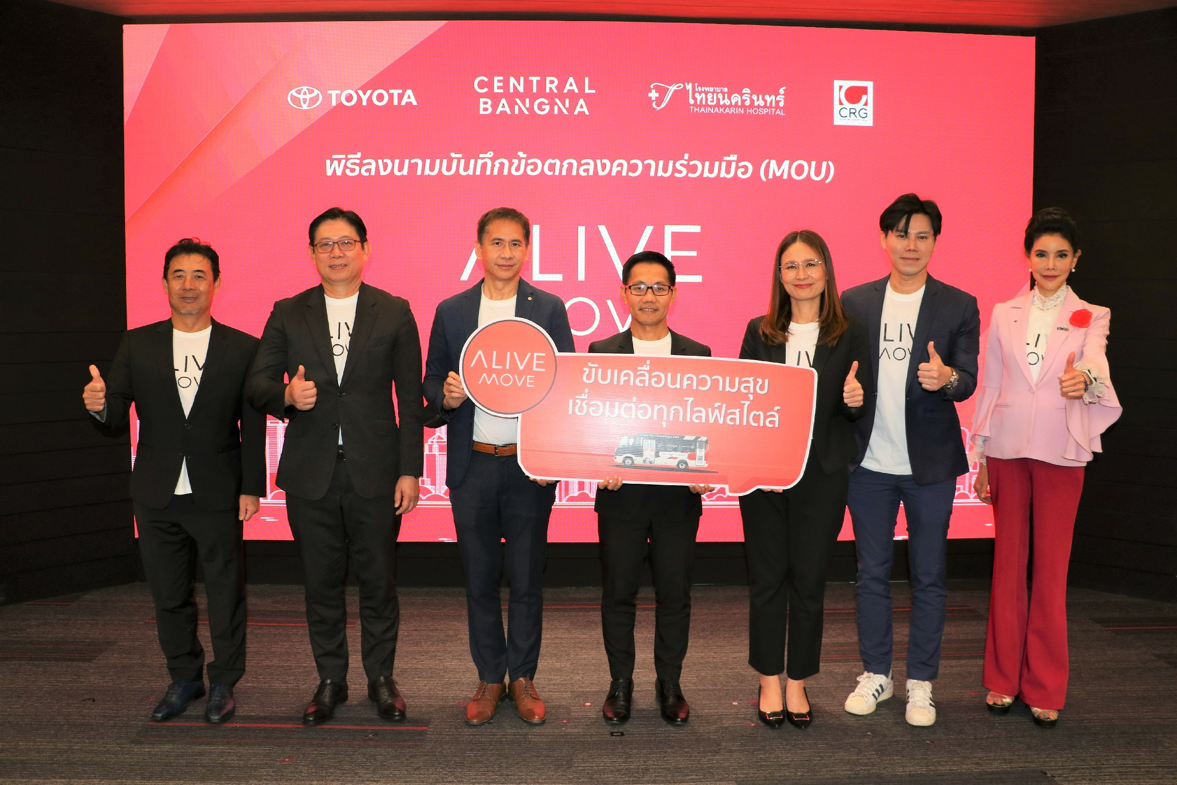 นายศุภกร รัตนวราหะ รองกรรมการผู้จัดการใหญ่ บริษัท โตโยต้า มอเตอร์ ประเทศไทย จำกัด ร่วมกับ นายฐิติ สิหนาถกถากุล ประธานบริหาร โรงพยาบาลไทยนครินทร์ และนางสาวธนัชชพร พงษ์เย็น ผู้จัดการทั่วไป ศูนย์การค้า เซ็นทรัล บางนา ร่วมลงนามบันทึกข้อตกลงเปิดตัวบริการรูปแบบใหม่ “ALIVE MOVE” ผนึกกำลังร่วมมือกันเพื่อสร้างสรรค์สิ่งดีๆ แก่สังคมไทย แบ่งปันประสบการณ์การเดินทางผ่านการให้บริการขนส่งมวลชน เพื่อเป็นประโยชน์ต่อสังคมโดยรวม แก้ปัญหาการขนส่ง และอำนวยความสะดวกของคนในเมือง เชื่อมต่อทุกไลฟ์สไตล์แบบ ไร้รอยต่อ พร้อมสิทธิประโยชน์มากมายจากพันธมิตร ทั้ง เซ็นทรัล ผู้นำห้างสรรพสินค้าที่เป็นแหล่งไลฟ์สไตล์ ทั้งกิน เที่ยว ชอป และ โรงพยาบาลไทยนครินทร์ ผู้นำการให้บริการด้านสุขภาพ เมื่อวันที่ 24 กุมภาพันธ์ ณ TOYOTA ALIVE SPACE บางนา