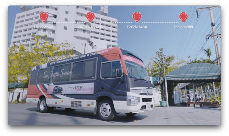 ถือเป็นก้าวสำคัญในการสร้างประสบการณ์ดีๆ ให้กับสังคมเมือง สามารถเช็คตารางการเดินมางของรถบัส และการจองรถจากสถานีรถไฟฟ้า BTS-อุดมสุข และ BTS-บางนา ไปยังห้างสรรพสินค้าเซ็นทรัล บางนา ได้ทุกวันโดยไม่เสียค่าบริการ เสริมด้วยระบบ GPS ที่ผูกกับแอปพลิเคชัน เพื่ออำนวยความสะดวกให้กับทุกคนด้วยความสามารถตรวจสอบตำแหน่งของรถบัสได้แบบ Real Time สนับสนุนให้ผู้คนสามารถเดินทางใช้ชีวิตได้อย่างมีความสุขโดยโตโยต้าได้จับมือกับ Central Pattana เครือข่ายห้างสรรพสินค้าชั้นนำของไทย ในมอบประสบการณ์ความสุขสำหรับทุกไลฟ์สไตล์ พร้อมส่วนลดจากร้านอาหารชื่อดังในเครือ Central Restaurant Group (CRG) ทั้ง Ootoya, Katsuya, Pepper Lunch, Chabuton, Yoshinoya, Tenya และร้านอาหารอื่นๆ ในห้างสรรพสินค้า ซึ่งทุกคนสามารถดาวน์โหลดแอปพลิเคชัน และรับส่วนลดได้ทันที พร้อมแผนการจัดงานต่างๆ ที่น่าสนใจตลอดปีนี้ซึ่ง ALIVE MOVE สามารถช่วยลดปัญหาที่จอดรถ และเสริมความสะดวกในการเดินทางได้อย่างมาก