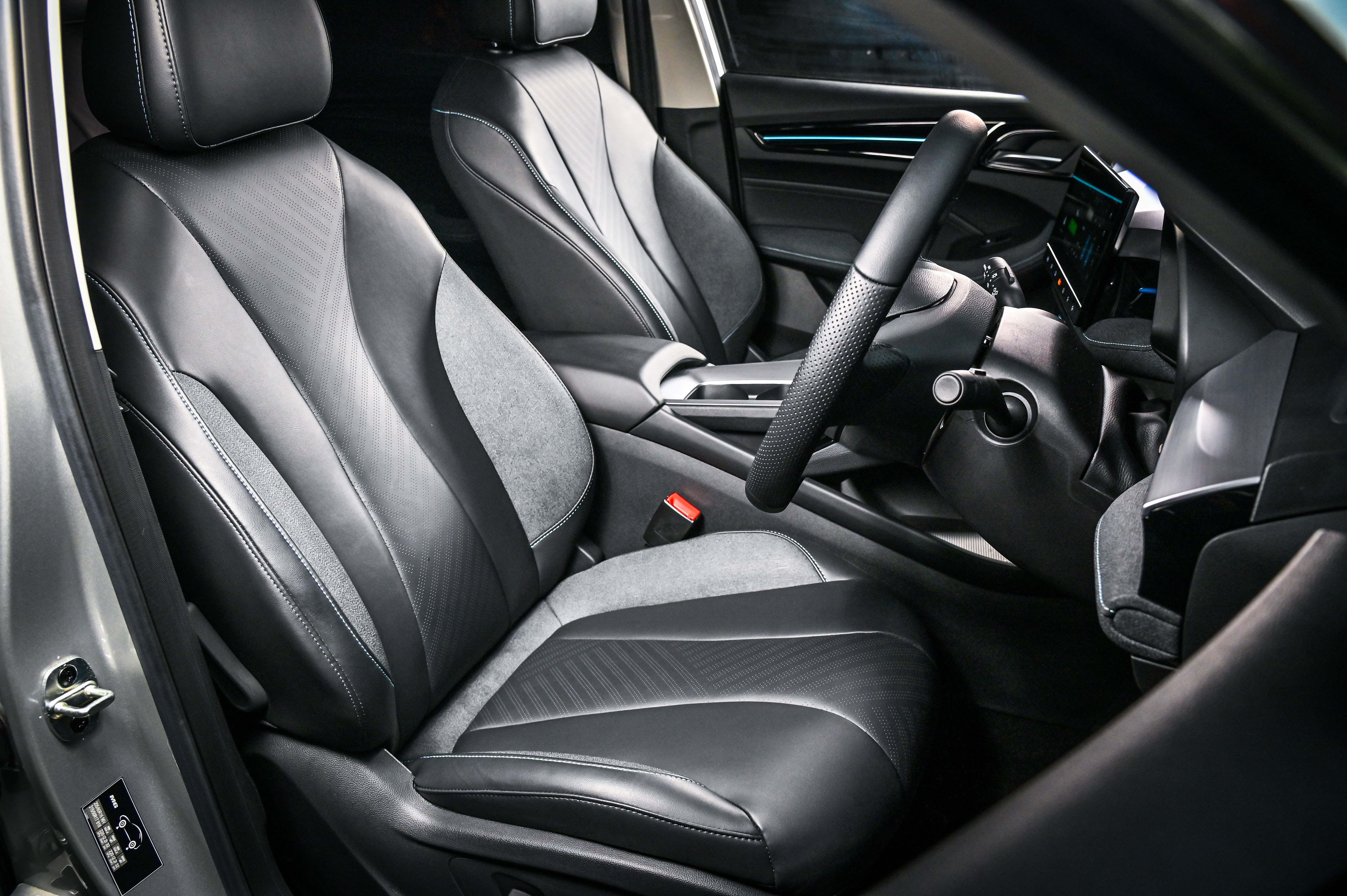 ·เบาะนั่งหุ้มด้วยวัสดุหนังสังเคราะห์ DENIM TEXTURE DESIGN กับผิวสัมผัสที่สบายและดูแลรักษาง่าย พร้อมเส้นสายการตกแต่งภายในโทนสีฟ้า ENERGETIC BLUE STRIP