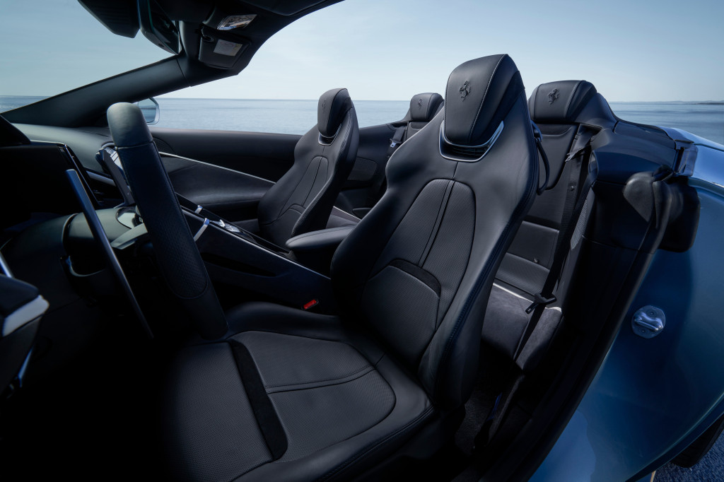ห้องโดยสารของเฟอร์รารี่ Roma Spider มีการจัดวางที่แทบจะสมมาตรกัน ทำให้เกิดการกระจายทั้งพื้นที่และองค์ประกอบการใช้งานที่เป็นธรรมชาติมากขึ้น ผลลัพธ์ที่ได้คือ ผู้โดยสารจะรู้สึกมีส่วนร่วมในประสบการณ์การขับขี่จนเหมือนเป็นผู้ช่วยคนขับ รูปทรงต่างๆ ได้รับการปั้นแต่งอย่างประณีตเพื่อสร้างส่วนเว้าส่วนโค้งเชิงประติมากรรมที่มีความต่อเนื่องทางพื้นผิว ระหว่างองค์ประกอบต่างๆ ทั่วทั้งห้องโดยสาร