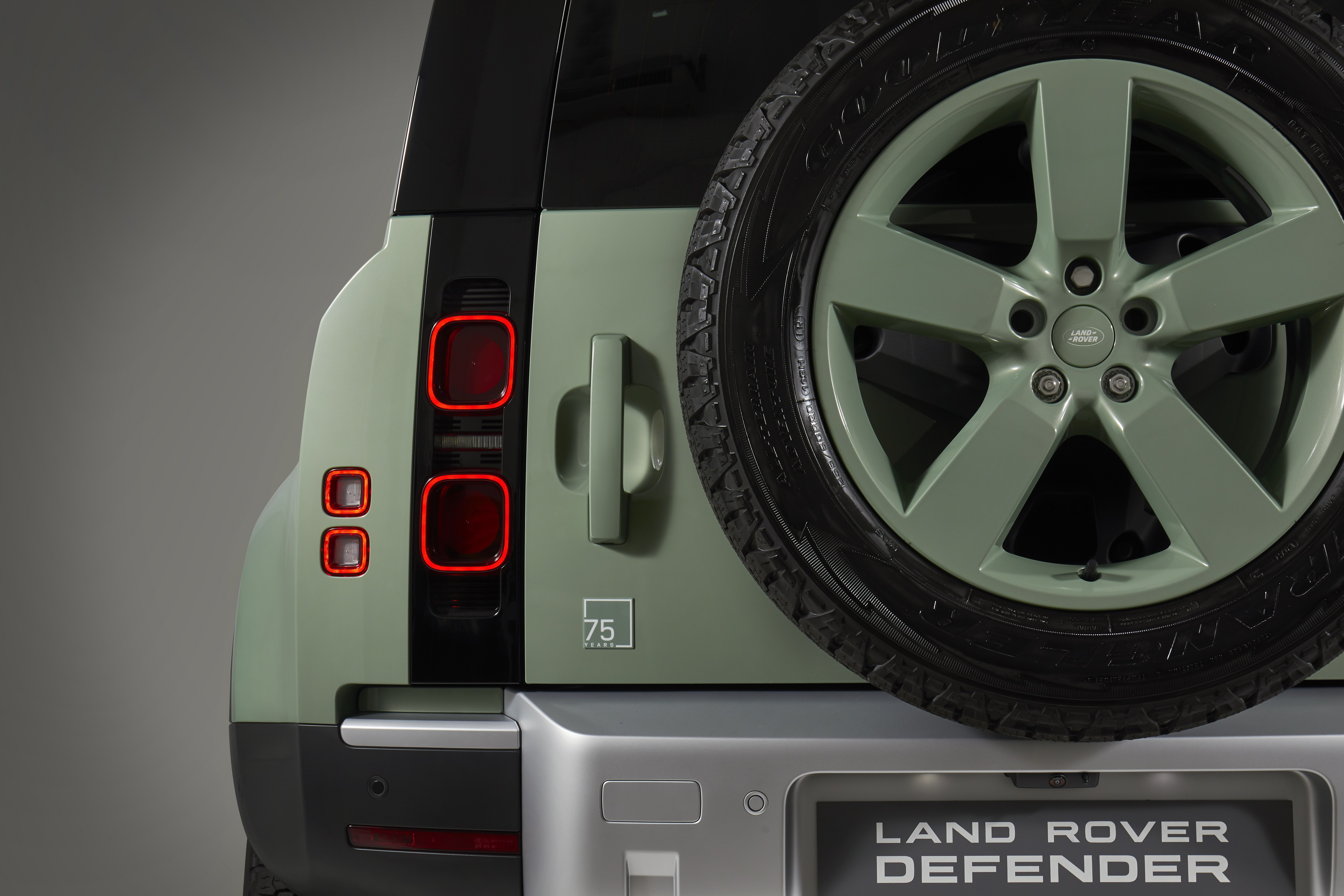 เมื่อปี 1948 รถยนต์ Series I ได้รับการเปิดตัวเป็นครั้งแรกในงานอัมสเตอร์ดัมมอเตอร์โชว์ (Amsterdam Motor Show) และ Defender 75th Limited Edition ก็ถือเป็นการเฉลิมฉลองวาระครบรอบ 75 ปีของแลนด์โรเวอร์ ด้วยการออกแบบภายนอกที่พิเศษอันเป็นเอกลักษณ์ ครั้งแรกกับสีภายนอก Glasmill Green สุดโดดเด่น ซึ่งเป็นเฉดสีที่สงวนไว้สำหรับรุ่น 75th Limited Edition โดยเฉพาะ ล้ออัลลอยขนาด 20 นิ้วมาในสี Grasmere Green เช่นกัน พร้อมฝาปิดเซ็นเตอร์แคปที่เข้าชุด การตกแต่งภายนอกสมบูรณ์ยิ่งขึ้นด้วยกราฟิกฉลอง 75 ปี