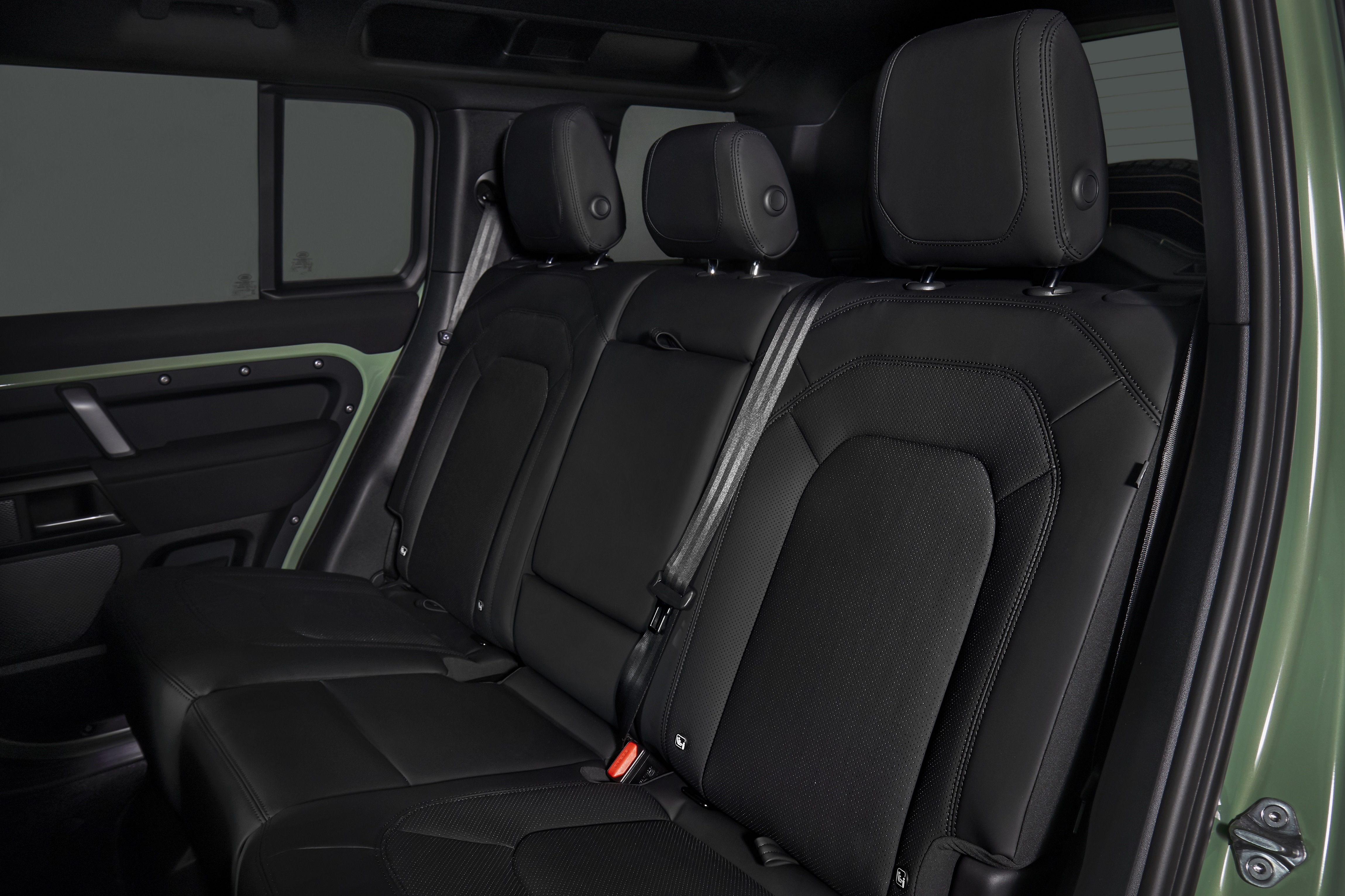 Defender ยังคงคุณสมบัติความทนทานและภายในห้องโดยสารที่อเนกประสงค์ไว้ โดยตกแต่ง Cross Car Beam ด้วยการพ่นสีขาวและมีรายละเอียดการสลักกราฟิกฉลอง 75 ปีด้วยเลเซอร์บนฝาปิดเอนด์แคป เบาะนั่งหุ้มด้วย Resist Ebony บริเวณแผงคอนโซลกลางใช้วัสดุ Robustec ที่เป็นโครงสร้างที่แข็งแรงทนทานที่สุดสำหรับรุ่น Defender