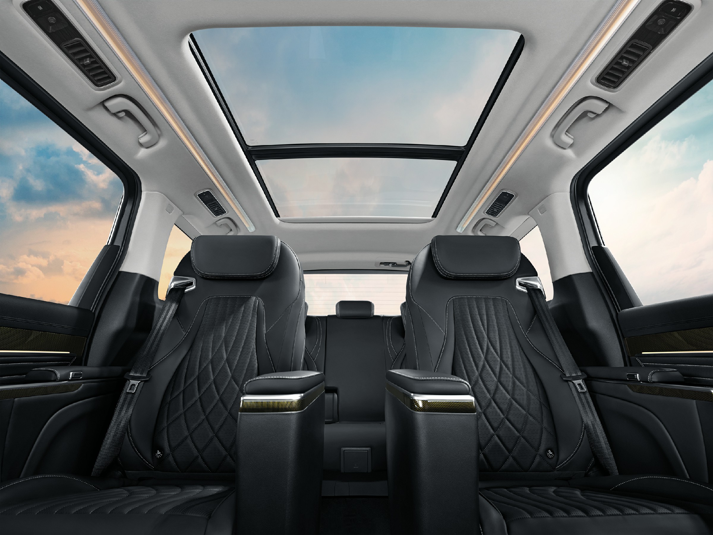 อีกหนึ่งความเคลื่อนไหวครั้งยิ่งใหญ่ในการก้าวสู่ทศวรรษที่ 2 ของ เอ็มจี คือ การมาของ NEW MG MAXUS 9 กับจุดเด่นของการเป็นแบรนด์แรกที่เปิดน่านน้ำสร้างเซกเมนต์ใหม่ ที่ผสานความลงตัวในการนำเสนอความเป็น “ที่สุด” ทั้งงานดีไซน์ที่โดดเด่น หรูหรา มีเอกลักษณ์ กระจังหน้าแบบ Grille Less Design ประตูข้างทั้ง 2 ฝั่งเป็นแบบสไลด์ด้วยไฟฟ้า พร้อมฝากระโปรงท้ายเปิด-ปิดด้วยไฟฟ้า การตกแต่งภายใน พรีเมี่ยม หรูหรา โดดเด่นด้วยหลังคาแบบ Dual Panoramic Sunroof ขนาดใหญ่ ทำให้ห้องโดยสารดูโปร่ง โล่ง ไม่อึดอัด อีกทั้งยังมี Ambient light ที่สามารถเลือกเปลี่ยนได้มากถึง 64 เฉดสี ที่ช่วยเพิ่มความสุนทรีย์ให้กับทั้งผู้ขับขี่และผู้โดยสาร ระบบปรับอากาศเป็นแบบ Dual Zone ทั้งด้านหน้าและด้านหลัง สะท้อนการออกแบบที่คำนึงถึงทุกพื้นที่ภายในรถ มาพร้อมกับความสะดวกสบายทุกที่นั่ง ไม่ว่าจะเป็นเบาะคนขับปรับไฟฟ้า 8 ทิศทาง เบาะผู้โดยสารด้านหน้าปรับไฟฟ้า 4 ทิศทาง และเบาะแถวที่สองแบบ VIP Captain Seat ซึ่งรังสรรค์ความพิเศษด้วยประสบการณ์เช่นเดียวกันกับที่นั่ง First Class บนเครื่องบิน โดยมีระบบบันทึก ระบบนวด และสามารถปรับระดับอุณหภูมิได้ตามความต้องการ พร้อมโต๊ะที่สามารถพับเก็บได้ จอกลางแบบสัมผัสขนาดใหญ่ 12.3 นิ้ว ใช้งานง่าย รองรับการเชื่อมต่อ Apple CarPlay และสมาร์ทโฟนระบบ Android ให้พลังเสียงแบบรอบด้านด้วยลำโพงมากถึง 12 จุด และไม่พลาดทุกการเชื่อมต่อด้วยช่อง USB มากถึง 9 ตำแหน่ง เสริมความพรีเมี่ยมด้วยกระจกมองหลังผ่านกล้อง Streaming Media Rearview Mirror กับมุมมองที่หาไม่ได้จากรถทั่วไป