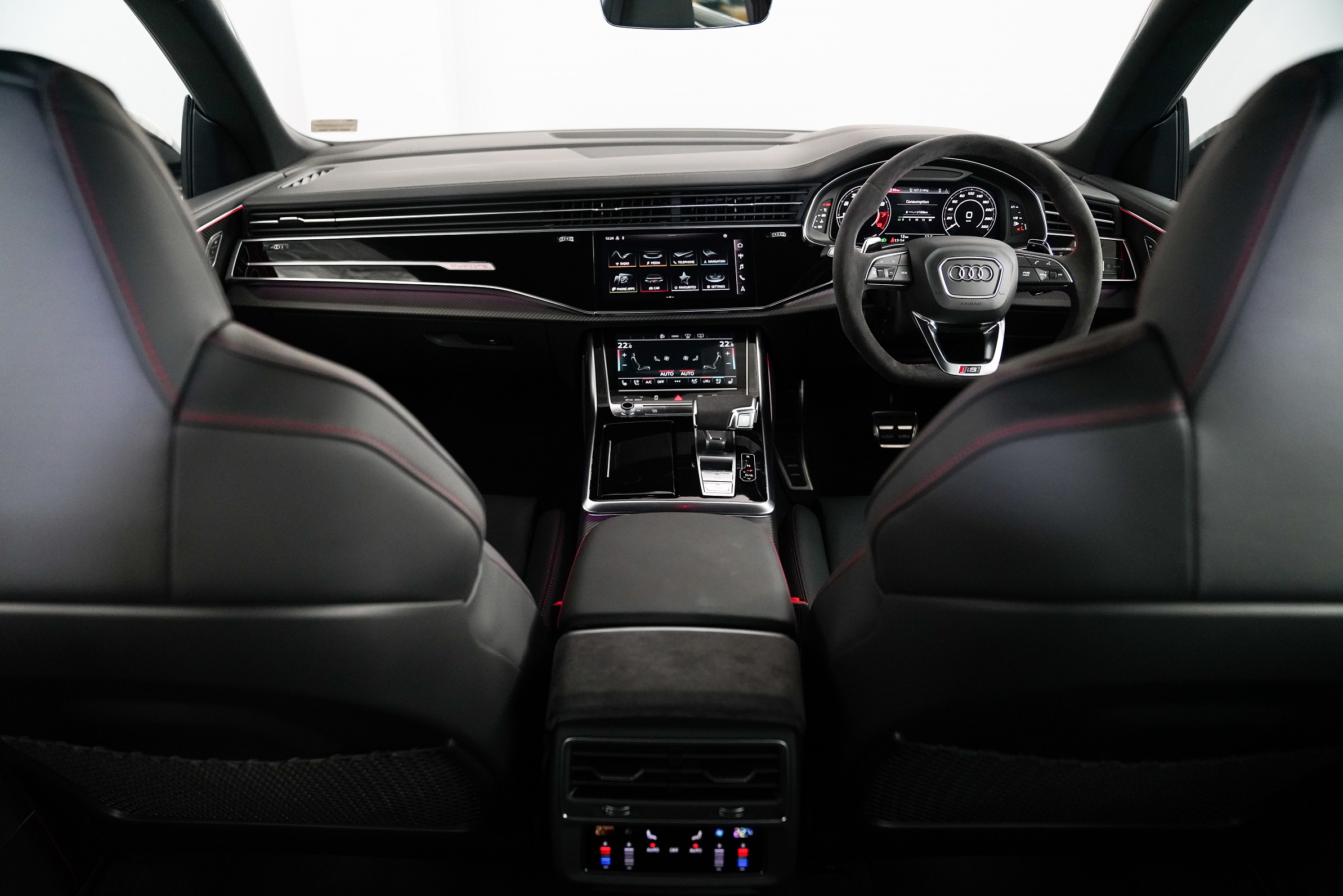การออกแบบที่สะท้อนตัวตนของ Audi อันเป็นเอกลักษณ์ แผงควบคุมภายใต้กรอบสีดำเงาบริเวณคอนโซลหน้าได้รับการออกแบบให้กลมกลืนและเชื่อมต่อถึงกันได้อย่างลงตัว แนวเส้นที่ลากยาวด้านหน้าให้ความรู้สึกของความกว้างขวาง ห้องโดยสารตกแต่งแบบสปอร์ตขั้นสุดผสานกับความล้ำสมัยตกแต่งภายในด้วยลาย Matte Carbon และหุ้มแผงประตูพร้อมตกแต่งคอนโซลกลางด้วย Alcantara การผสมผสานอย่างลงตัวของการออกแบบร่วมสมัยและ DNA มอเตอร์สปอร์ตแบบ Central command ทำให้การตกแต่งภายในของ Audi RS Q8 เต็มเปี่ยมไปด้วยสมรรถนะการขับขี่ และสะดวกสบายกับการใช้งานที่ลงตัวในทุกไลฟ์สไตล์ ระบบเครื่องเสียงระดับพรีเมียม Bang & Olufsen พร้อมระบบเสียง 3 มิติ มอบประสบการณ์เสียงที่ดีที่สุดระดับคอนเสิร์ตฮอลล์ คุณภาพเสียงสมบูรณ์แบบผ่านลำโพงคุณภาพสูง 17 ตำแหน่งที่มีกำลังขับรวม 730 วัตต์