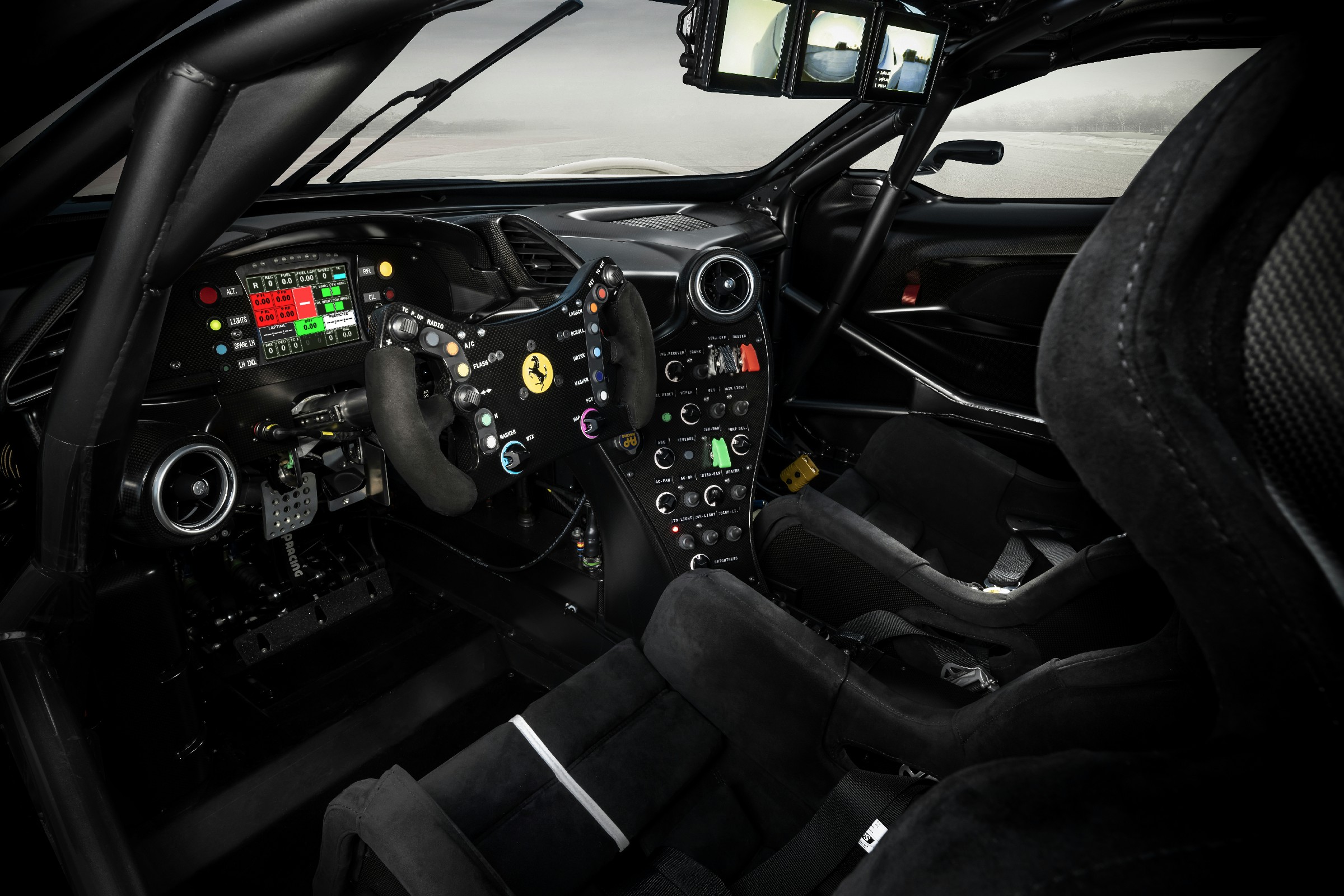 ห้องโดยสารคงความเป็น 488 GT3 Evo 2020 ไว้ให้มากที่สุดเท่าที่จะเป็นไปได้ เว้นเพียงแผงประตูและแดชบอร์ดฝั่งผู้โดยสารเท่านั้นที่แตกต่างออกไป เบาะที่ออกแบบขึ้นเฉพาะสำหรับ KC23 หุ้มด้วยหนัง Alcantara พร้อมตราสัญลักษณ์ที่เชื่อมติดด้วยการเชื่อมไฟฟ้า ทำให้ห้องโดยสารดูหรูหราเข้ากับการตกแต่งภายนอกอย่างสมบูรณ์แบบ ทัศนวิสัยการมองด้านหลังปรับปรุงให้แม่นยำขึ้นด้วยการใช้กล้อง (แทนกระจกมองข้างแบบดั้งเดิม) ซึ่งช่วยในเรื่องอากาศพลศาสตร์ของรถไปในตัว จากการไร้ซึ่งกรอบกระจกเหมือนรถทั่วไป ทำให้ส่วนข้างของรถเรียบเนียนขึ้น