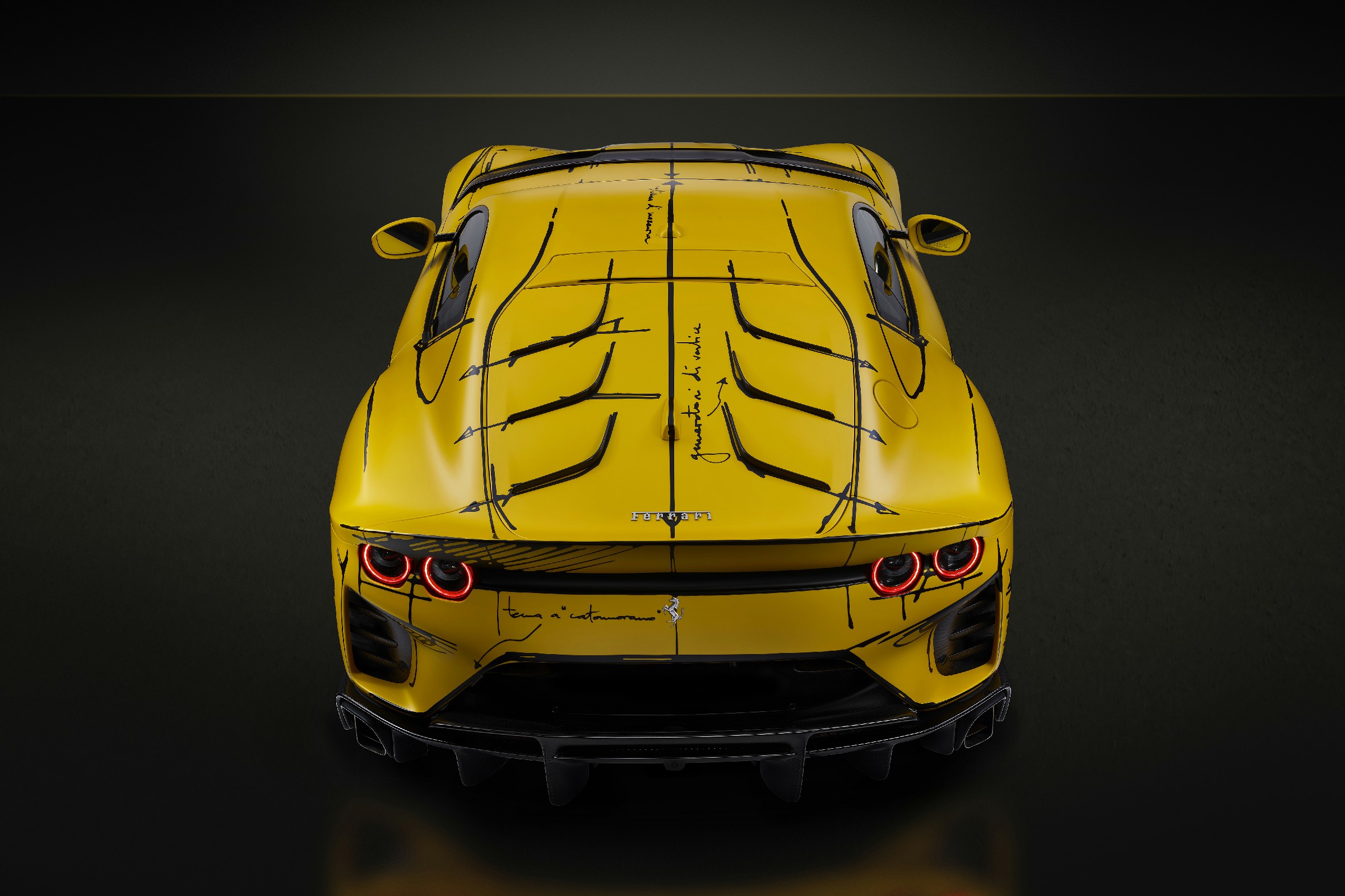 รถคันนี้ถูกจินตนาการเป็นกระดาษโน้ตสีเหลือง ที่ปัจจุบันกลายเป็นสิ่งที่ดีไซเนอร์ของเฟอร์รารี่นิยมนำมาใช้เขียนถ่ายทอดเป็นจุดเริ่มต้นของไอเดียความคิด และจดบันทึกสิ่งที่ได้จากจินตนาการ ลงสู่กระดาษ ทำแบบนี้ซ้ำแล้วซ้ำเล่า จากรายละเอียดสู่รายละเอียด ไอเดียสู่ไอเดีย รูปร่างลักษณะและเค้าโครงจากคอนเซปต์ใหม่เหล่านี้ ถูกนำมาปะติดปะต่อจนออกมาเป็นตำนานแห่งอุตสาหกรรมการออกแบบยานยนต์ในท้ายที่สุด