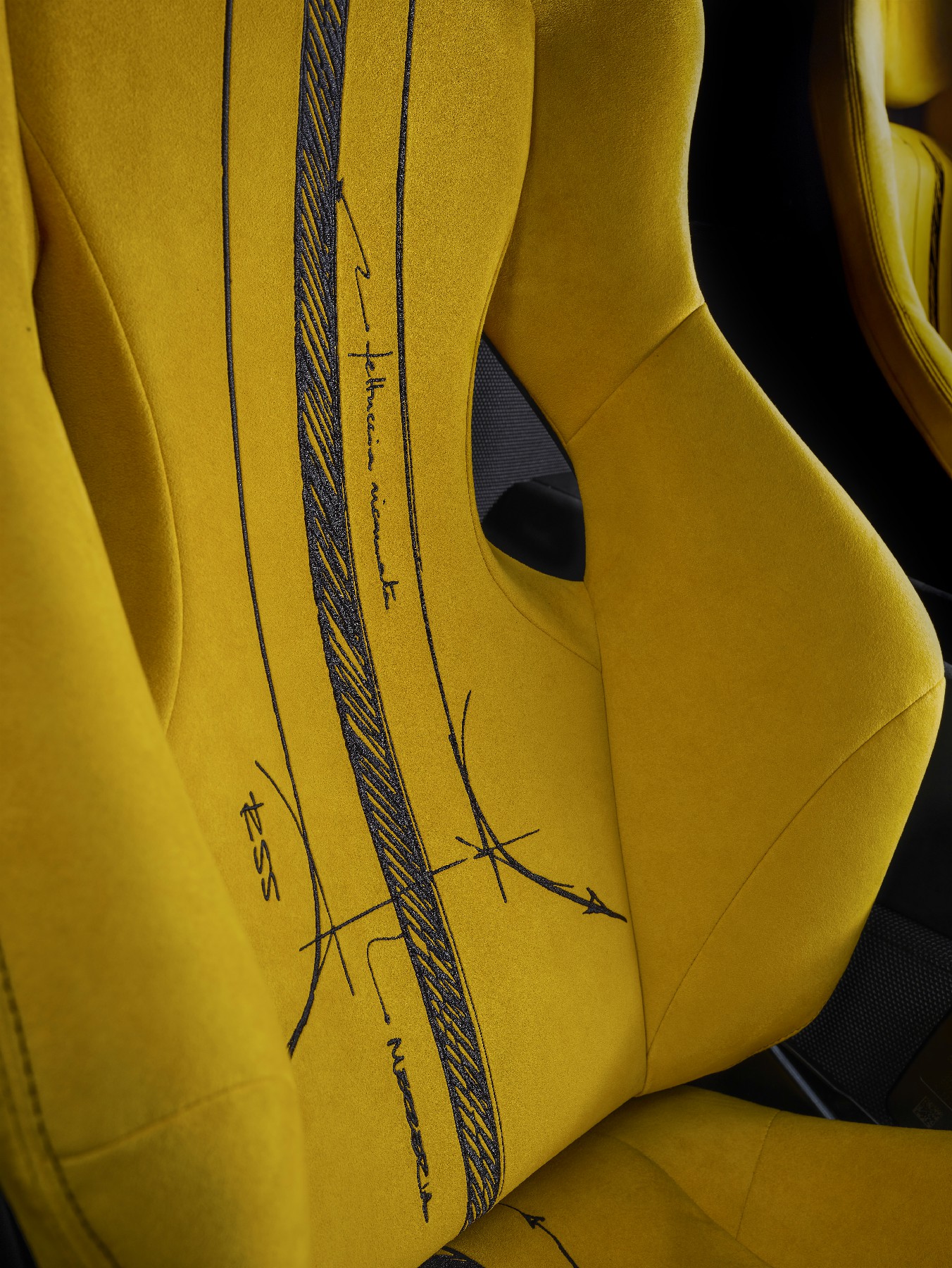 บนตัวถังสี ‘Giallo Tristrato’ ลายเส้นที่มาจากดีไซเนอร์ผู้ใส่จินตนาการความสง่างามและรูปแบบอันโฉบเฉี่ยว ตลอดจนรายละเอียดที่โดดเด่นต่างๆ ให้กับ 812 Competizione ถูกขีดเขียนลงไปด้วยสี ‘Nero DS Sketch’ สะดุดตาด้วยครีบคาร์บอนไฟเบอร์ที่พาดขวางอยู่บนฝากระโปรงหน้าเพื่อทำหน้าที่รับอากาศป้อนสู่เครื่องยนต์ ครีบระบายอากาศบริเวณแก้มข้างที่สะท้อนถึงความเป็นที่สุดของรถยนต์เฟอร์รารี่ตระกูล V12 ร่วมด้วยครีบสร้างกระแสอากาศหมุนวนที่ฝาท้ายแบบปิดทึบ โดยใช้กล้องมองหลัง (Rear-view camera) มาทำหน้าที่แทนกระจกบานหลัง
