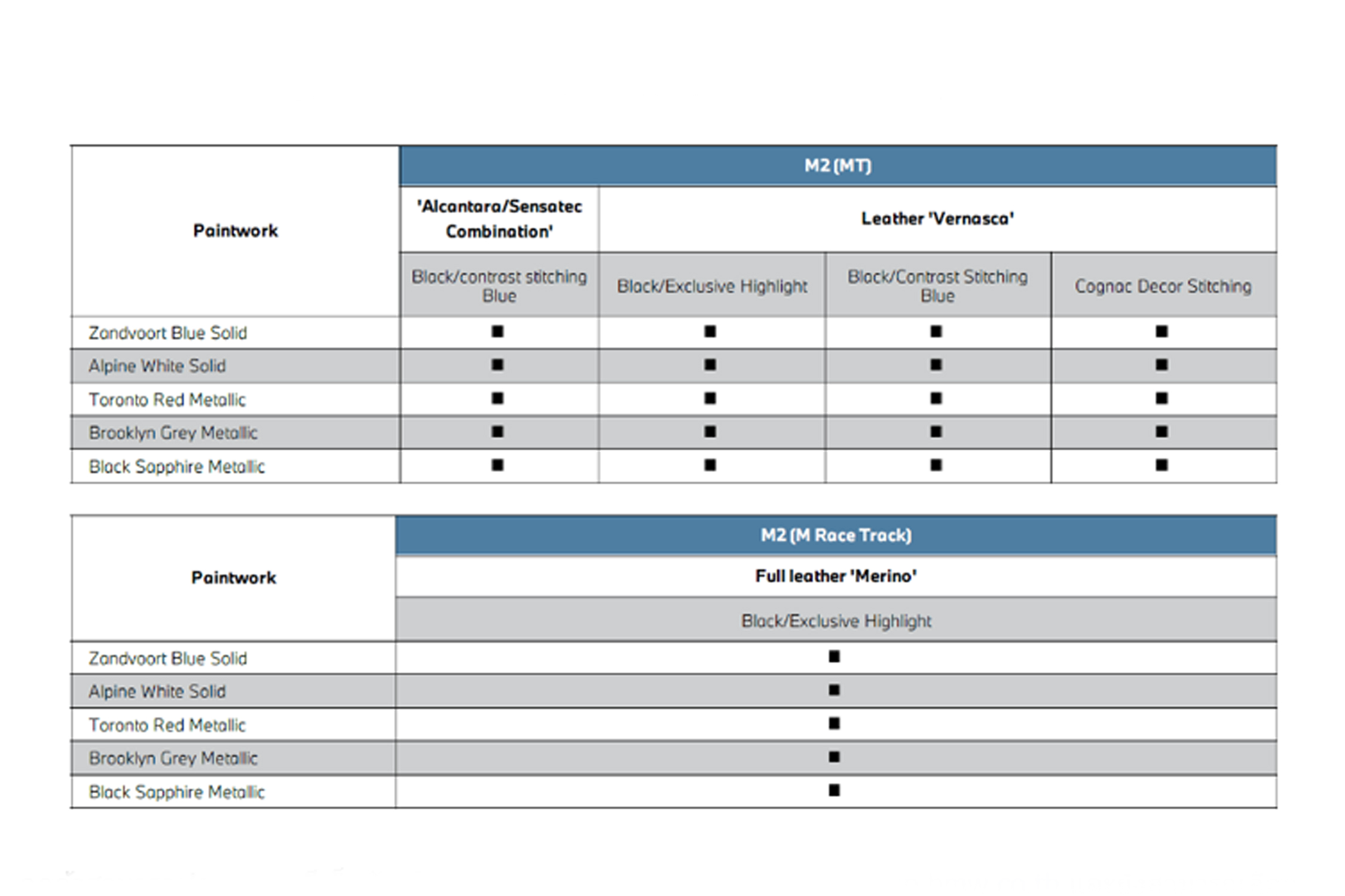บีเอ็มดับเบิลยู M2 มาให้เลือก 5 สี ได้แก่ สีฟ้า Zandvoort Blue Solid, สีขาว Alpine White, สีเทา Brooklyn Grey Metallic, สีดำ Black Sapphire Metallic และสีแดง Toronto Red Metallic ต่าง ๆ ได้แก่