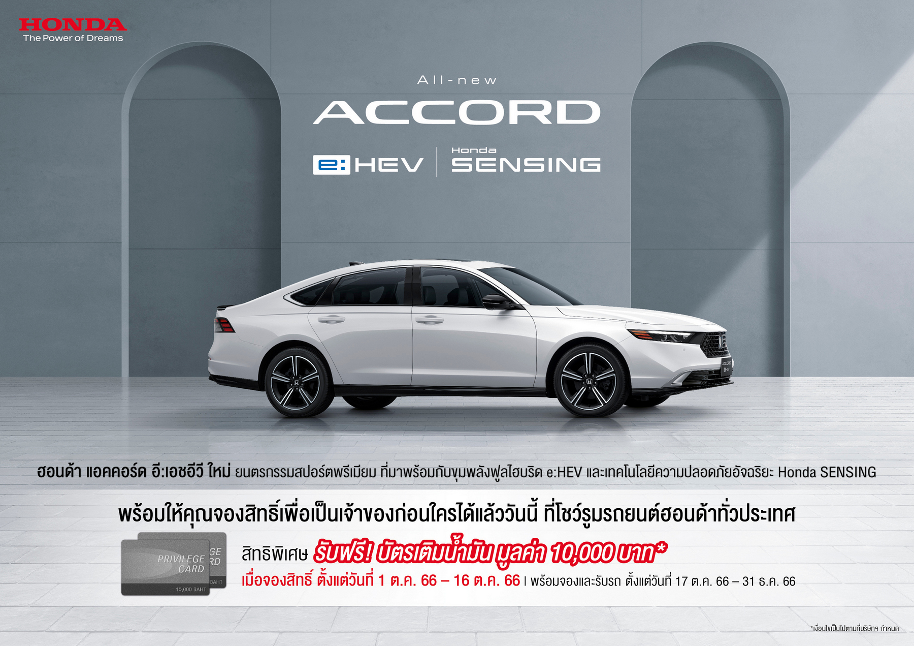 พิเศษ สำหรับลูกค้าที่ลงทะเบียนจองสิทธิ์ ฮอนด้า แอคคอร์ด อี:เอชอีวี ใหม่ ตั้งแต่วันที่ 1 ตุลาคม 2566 ตั้งแต่เวลา 10.00 น. – วันที่ 16 ตุลาคม 2566 เวลา 22.00 น.** รับฟรีบัตรเติมน้ำมันมูลค่า 10,000 บาท**