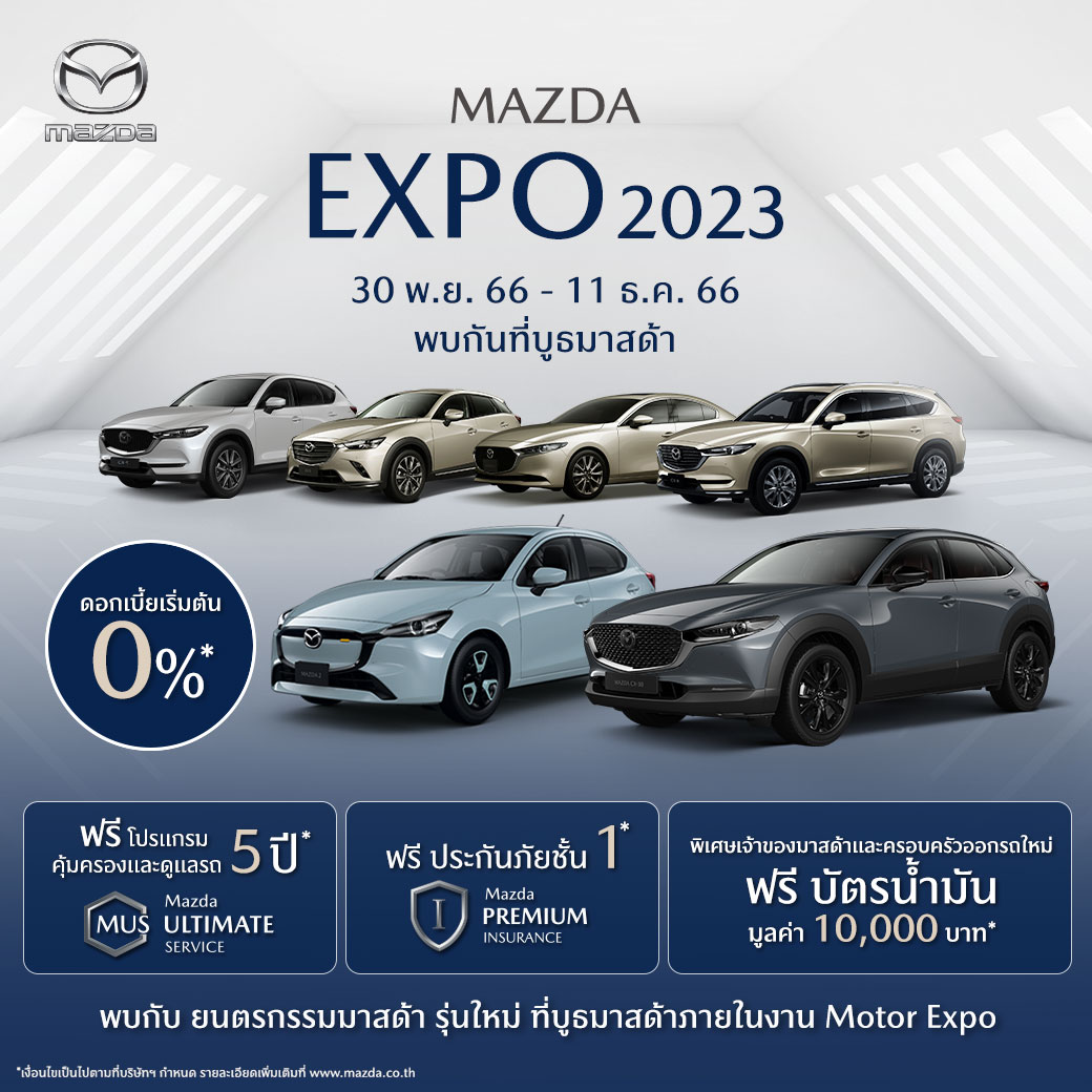ลูกค้าที่สนใจสามารถเข้าชมรถยนต์มาสด้าทุกรุ่นได้ที่งาน มอเตอร์ เอ็กซ์โป 2023 ณ อิมแพ็ค เมืองทองธานี รับโปรโมชั่นสุดคุ้มแห่งปี อาทิ ดอกเบี้ยต่ำสุด 0% ฟรีประกันภัยชั้นหนึ่ง Mazda Premium Insurance 1 ปี ฟรีแพ็กเกจบำรุงรักษารถตามระยะ Mazda Care 5 ปี (รวมค่าแรง ค่าอะไหล่ และของเหลว) ฟรีโปรแกรมคุ้มครองและดูแลรถ 5 ปี Mazda Ultimate Service ส่วนลดสูงสุด 120,000 บาท ฟรีของพรีเมี่ยมสุดพิเศษจากมาสด้า และขอมอบสิทธิพิเศษให้กับเจ้าของรถมาสด้าและครอบครัว เมื่อออกรถใหม่รับฟรีบัตรน้ำมัน มูลค่า 10,000 บาท* ตั้งแต่วันนี้ จนถึง 11 ธ.ค. 66 ในงาน มอเตอร์ เอ็กซ์โป 2023 หรือที่โชว์รูมมาสด้าทั่วประเทศ