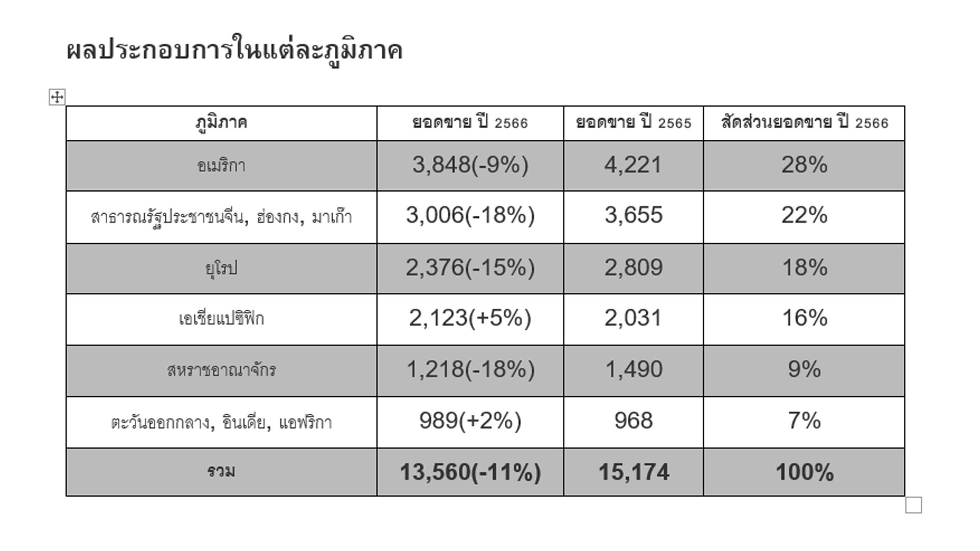 สำหรับผลประกอบการในแต่ละภูมิภาคท่ามกลางสภาวะเศรษฐกิจที่ฝืดเคือง ภูมิภาคเอเชียแปซิฟิกมีอัตราการเติบโตในเชิงบวกสูงที่สุดที่ร้อยละ 5 ส่วนภูมิภาคตะวันออกกลาง อินเดีย และแอฟริกามีอัตราการเติบโตร้อยละ 2 แต่ในตลาดหลักอย่างสาธารณรัฐประชาชนจีนและสหราชอาณาจักรหดตัวลงกว่า 18%