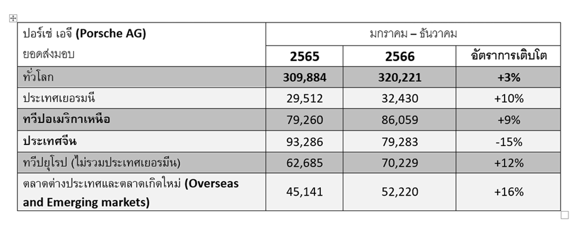 ปอร์เช่ (Porsche) ประสบความสําเร็จด้วยตัวเลขการเติบโตที่แข็งแกร่งในปีงบประมาณ 2566 โดยมียอดการส่งมอบเพิ่มขึ้น ผู้ผลิตรถสปอร์ตรายนี้ได้ส่งมอบรถยนต์จำนวน 320,221 คันในช่วง 12 เดือนที่ผ่านมา นี่คือการเพิ่มขึ้นในอัตรา 3% จากปี 2565 เดทเลฟ วอน พลาเทน (Detlev von Platen) สมาชิกคณะกรรมการบริหารฝ่ายขายและการตลาดของปอร์เช่ เอจี (Porsche AG) กล่าวว่า "แม้จะอยู่ในช่วงเวลาแห่งความไม่แน่นอนของเศรษฐกิจโลก แต่แบรนด์ของเรายังคงเป็นที่นิยม และปีที่แล้วเรามียอดขายปอร์เช่ที่ใหญ่ที่สุดจากในหลายภูมิภาค เราจะยังคงเพิ่มประสิทธิภาพการกระจายตลาดที่สมดุลนี้ต่อไป”