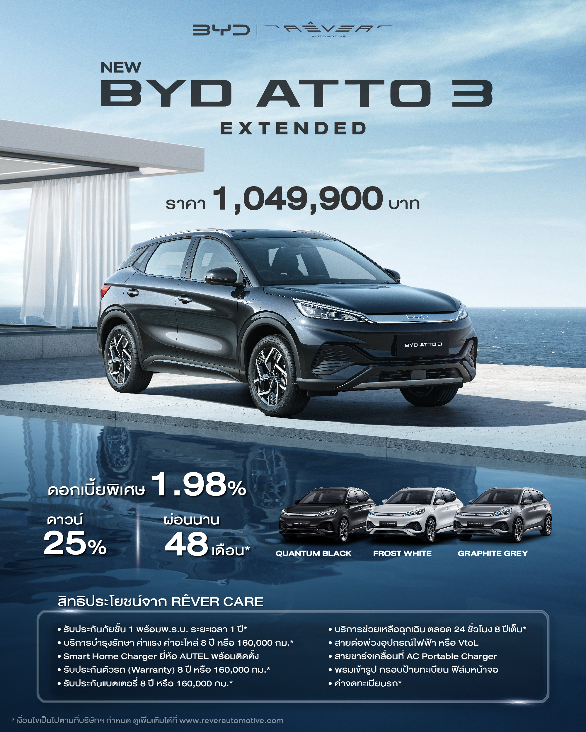 ลูกค้าที่ซื้อ BYD ATTO 3 Standard รุ่นปี 2023 รับส่วนลดเงินสด 200,000 บาท เหลือเพียง 899,900 บาท (จากราคาปกติ 1,099,900 บาท) พร้อมสิทธิพิเศษ RÊVER มูลค่ารวมกว่า 400,000 บาท