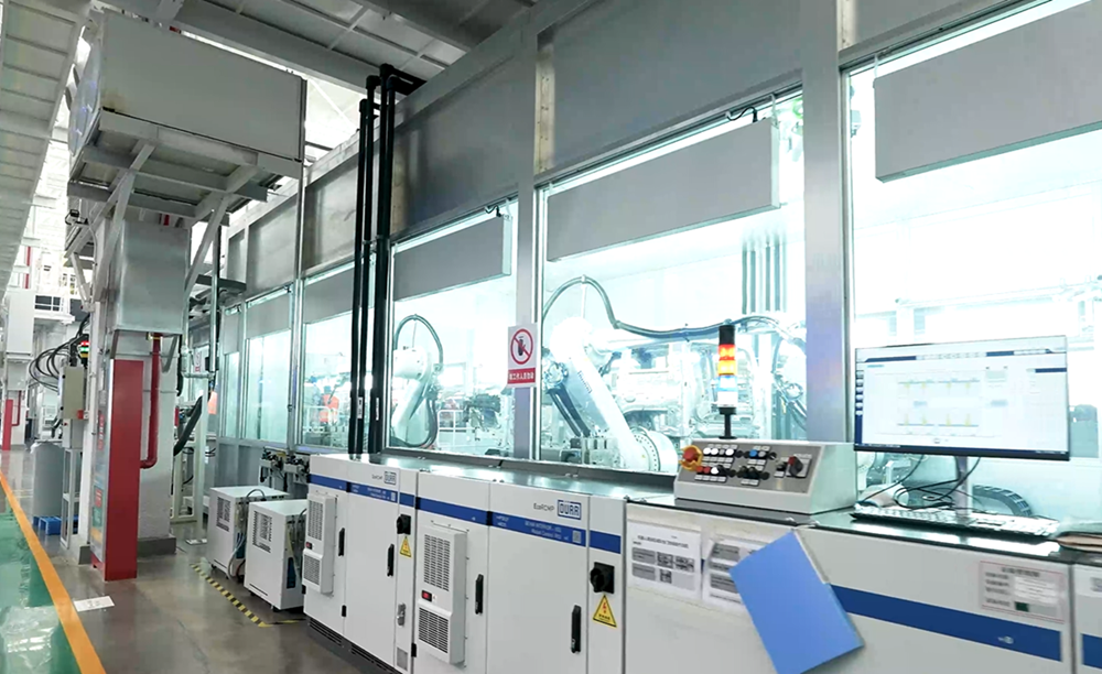 กระจกของชุดกระจกบังลมด้านหน้าและด้านหลังใช้โซลูชันที่ครบวงจรในอุตสาหกรรม ด้วยหุ่นยนต์ในการประกอบอัตโนมัติที่มีความแม่นยำสูง จำนวน 9 ตัว ประกอบด้วย ระบบเคลื่อนย้ายอัตโนมัติ ระบบทำความสะอาดกระจก ระบบพ่นสีรองพื้นกระจกอัตโนมัติ ระบบติดกาว และระบบประกอบอัตโนมัติ ที่มีความแม่นยำในระดับ 0.05 มิลลิเมตร สามารถประกอบได้สูงสุด 60 คันต่อชั่วโมง พร้อมกันหลายรุ่นในไลน์ผลิตเดียวกัน ด้วยคุณภาพสูงที่เสถียร พร้อมเทคโนโลยีการถ่ายภาพ ประมวลผลภาพ 3 มิติ และระบบอัลกอริธึมวิเคราะห์คุณภาพการประกอบแบบเรียลไทม์ เพื่อตรวจหาตำหนิจากการเคลือบ ซึ่งสามารถรับประกันประสิทธิภาพ และความสม่ำเสมอของผลิตภัณฑ์ได้แม่นยำ