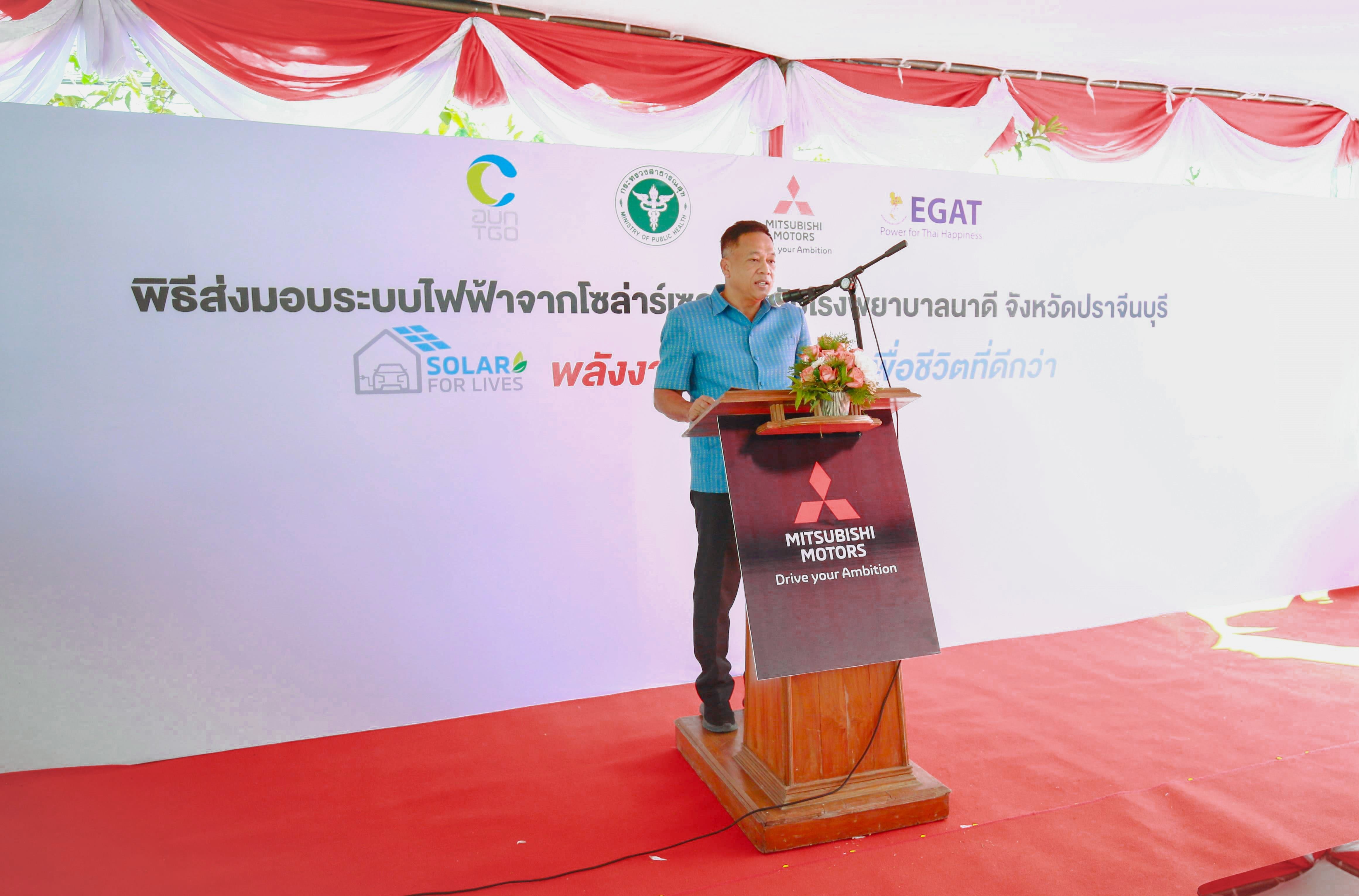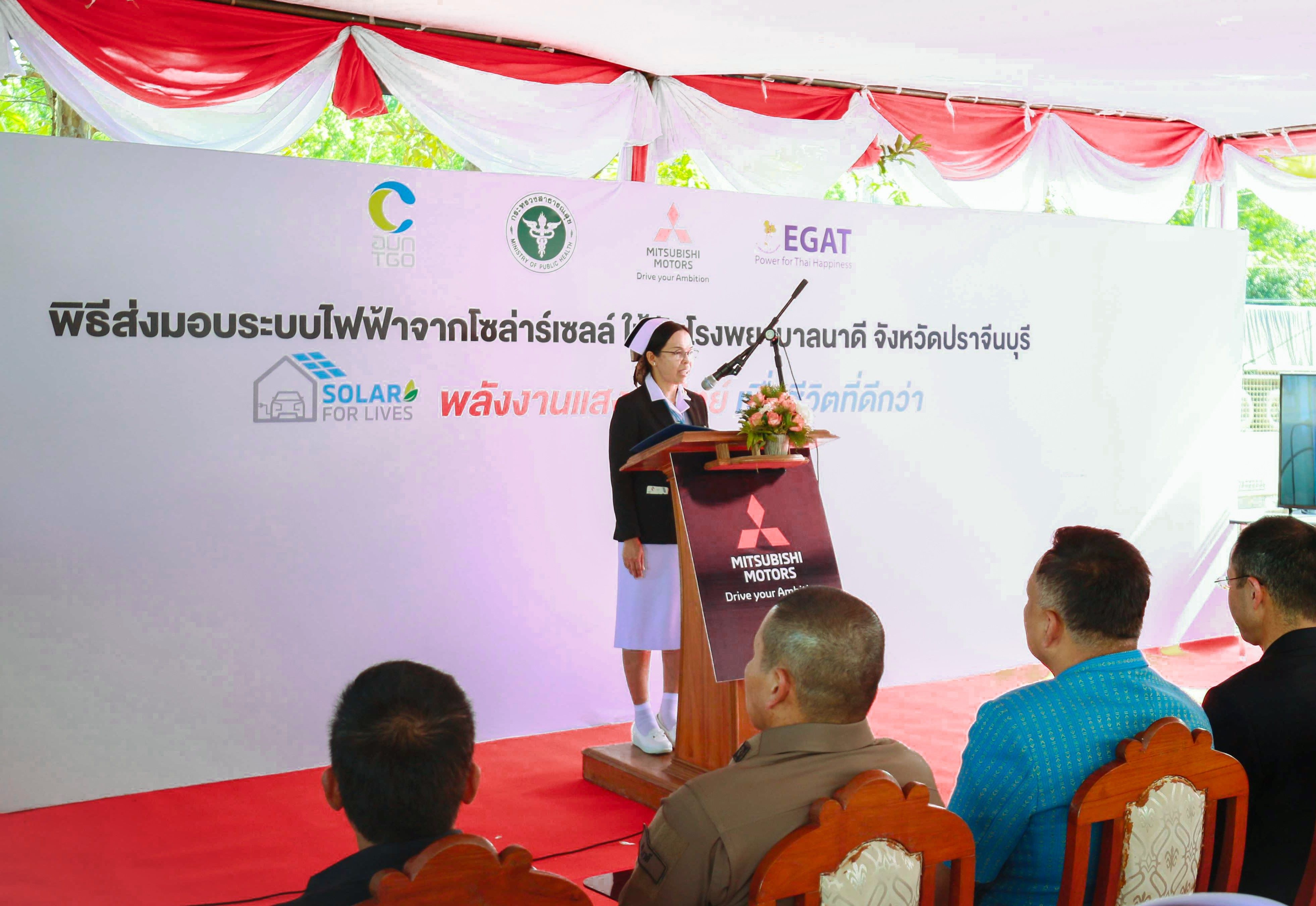 มร. เออิจิ โอกาวะ กรรมการรองผู้จัดการใหญ่ สายงานผลิต มิตซูบิชิ มอเตอร์ส ประเทศไทย เปิดเผยว่า “โครงการ ‘Solar For Lives : พลังงานแสงอาทิตย์ เพื่อชีวิตที่ดีกว่า’ เป็นหนึ่งในความมุ่งมั่นของแผนการดำเนินงานเพื่อสังคม ภายใต้วิสัยทัศน์ ‘สรรค์สร้าง เคียงข้าง สังคมไทย’ ใน 3 ด้านหลัก คือ การศึกษา สิ่งแวดล้อม และสุขภาพ ของ มิตซูบิชิ มอเตอร์ส ประเทศไทย โดยเราได้วางแผนใช้เงินลงทุนกว่า 60 ล้านบาท เพื่อติดตั้งและบำรุงรักษาระบบไฟฟ้าจากโซล่าร์เซลล์ขนาด 50 กิโลวัตต์ ให้แก่แต่ละโรงพยาบาลชุมชนทั่วประเทศ 40 แห่ง ภายในช่วงระยะเวลา 10 ปี เพื่อสร้างแหล่งพลังงานที่ยั่งยืนให้กับโรงพยาบาล และยกระดับการให้บริการด้านสุขภาพที่ดีให้กับคนไทย พร้อมส่งเสริมเป้าหมายเชิงยุทธศาสตร์ของรัฐบาลไทยที่มุ่งขับเคลื่อนประเทศไทยสู่การเป็นสังคมคาร์บอนเป็นกลาง โดยคาดว่าโครงการนี้จะสามารถช่วยลดการปล่อยก๊าซคาร์บอน ไดออกไซด์ ของโรงพยาบาลนาดีได้กว่า 30 ตันคาร์บอนต่อปี”