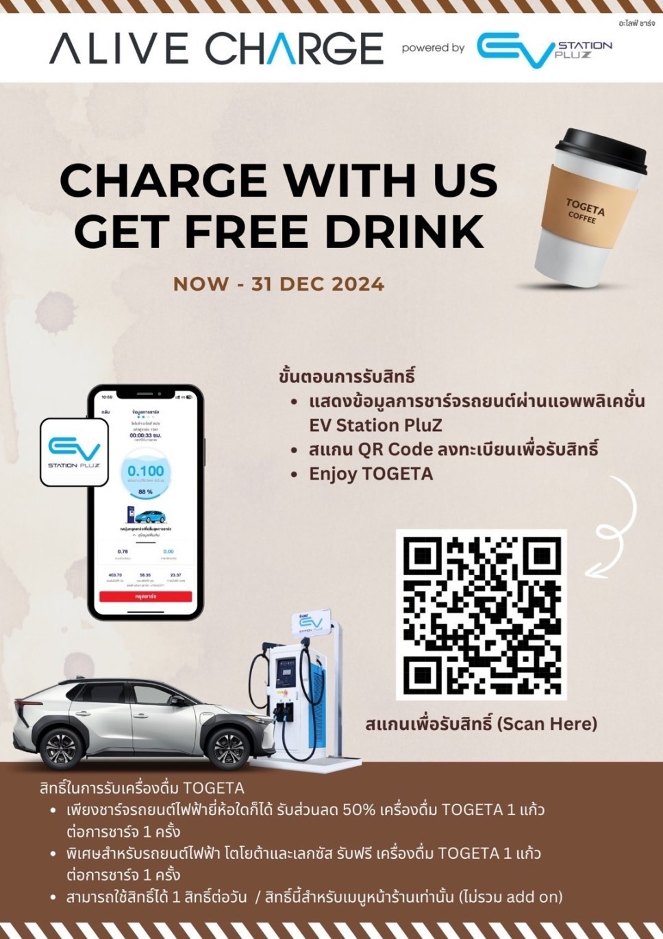 · ชาร์จรถยนต์ยี่ห้ออื่น รับส่วนลด 50% สำหรับกาแฟ Togeta ต่อการชาร์จหนึ่งครั้ง