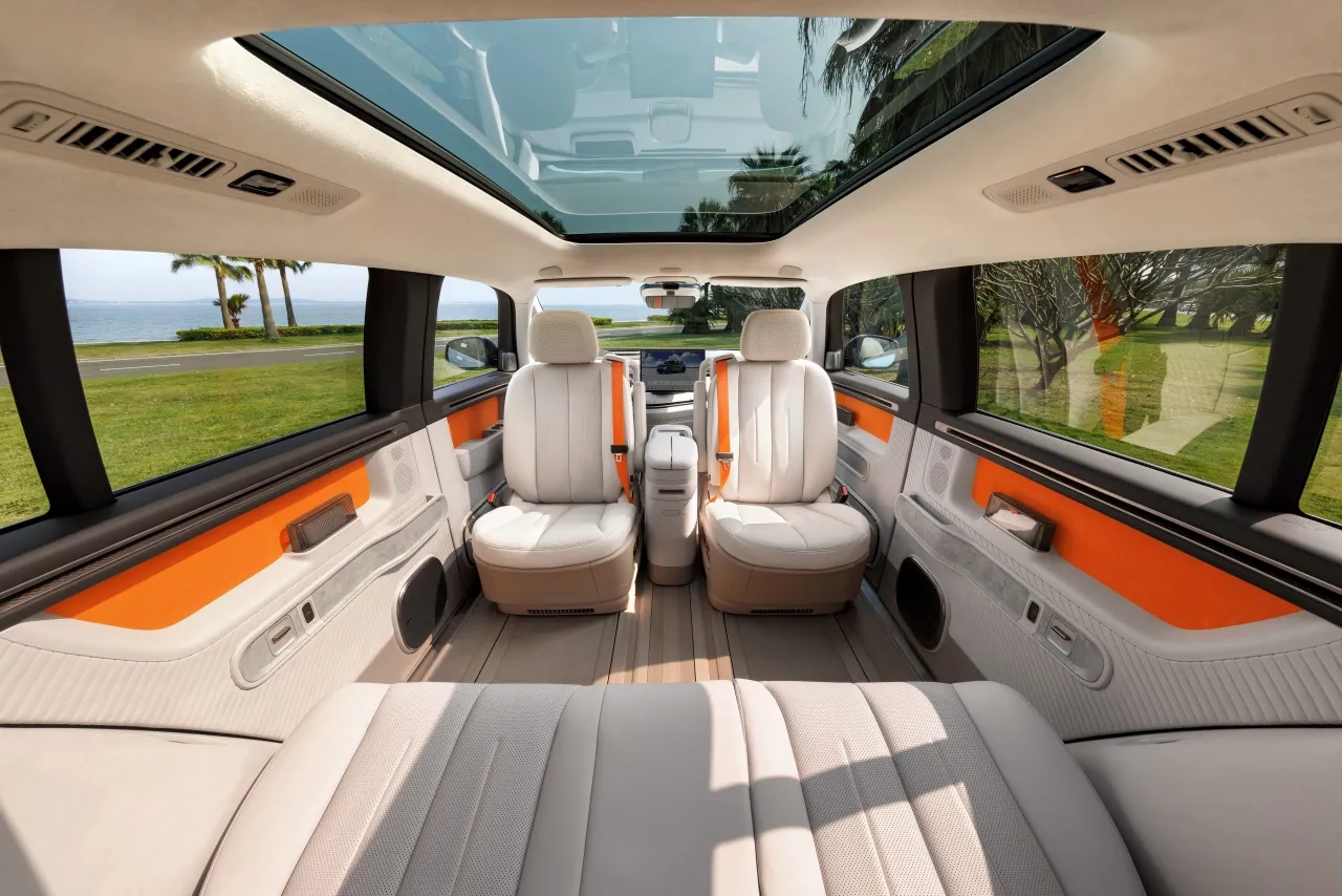 ภายในรถมีที่นั่ง 5 ที่นั่ง โดยเบาะคู่หน้าสามารถหมุนได้ 270 องศา และยังมีฟีเจอร์พิเศษคือ โต๊ะพับ พร้อมช่องเก็บของที่มีฟังก์ชันเป็นตู้เย็นด้วย ระบบเบาะนั่งภายในสามารถปรับเปลี่ยนได้ถึง 9 แบบ ซึ่งคุณสามารถพับเบาะทั้งหมดลงเพื่อเปลี่ยนห้องโดยสารให้กลายเป็นที่นอน