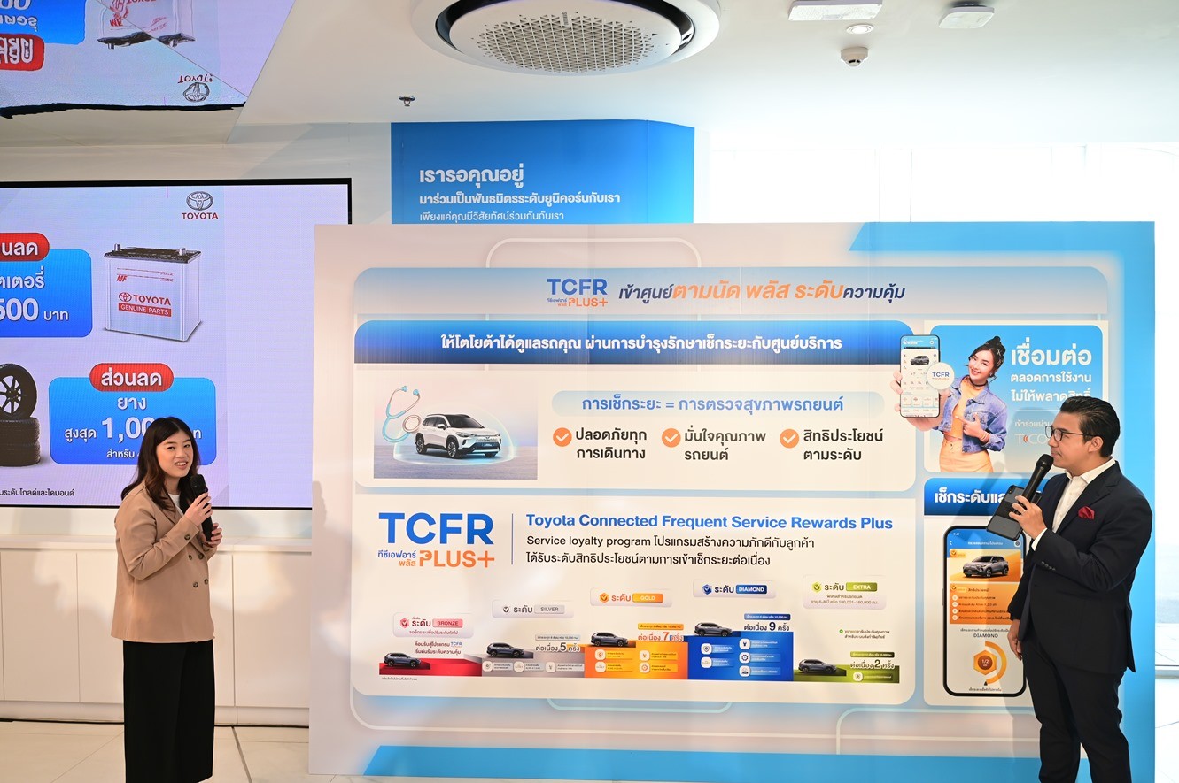 นายรุ่งโรจน์ กล่าวแนะนำการพัฒนายกระดับโปรแกรม TCFR ขึ้นใหม่ “เรียกว่า TCFR Plus+ ซี่งเป็น (Service Loyalty Program) อย่างเต็มรูปแบบ ด้วยวัตถุประสงค์เพื่อตอบแทนลูกค้าคนสำคัญ ที่เข้าเช็กระยะกับศูนย์บริการมาอย่างต่อเนื่อง ขยายโปรแกรมให้ครอบคลุมลูกค้าโตโยต้าทุกคน ทั้งลูกค้ารถยนต์เก่าและรถยนต์ใหม่ รวมถึงเพิ่มสิทธิประโยชน์อีกมากมายตลอดอายุการใช้งาน ตั้งแต่ส่งมอบรถยนต์ใหม่ จนถึงการเปลี่ยนรถยนต์ใหม่คันถัดไป”