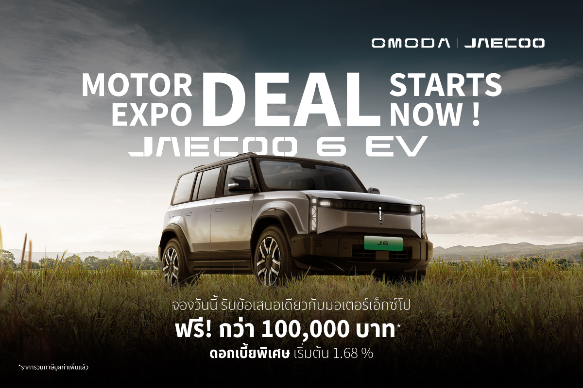 จอง JAECOO 6 EV วันนี้ รับข้อเสนอ “แคมเปญ Motor Expo Deal: JAECOO 6 EV พร้อมทุกสภาพถนนก่อนใคร” สำหรับผู้ที่จอง JAECOOO 6 EV รับข้อเสนอเดียวกับ Motor Expo มูลค่ากว่า 100,000 บาท** กับข้อเสนอพิเศษ ประกอบด้วย
