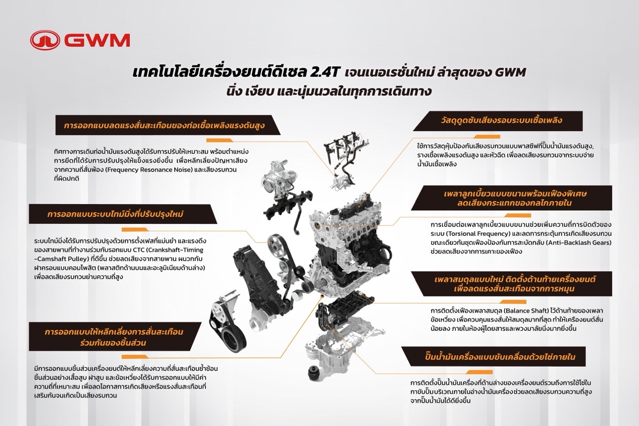 · การออกแบบระบบไทม์มิ่งที่ปรับปรุงใหม่ (Optimized Timing System Design) GWM มีการออกแบบระบบไทม์มิ่งใหม่ทั้งความตึงสายพานและลูกรอกที่มีการปรับให้เหมาะสม เพื่อช่วยลดเสียงรบกวนของสายพานในขณะทำงาน นอกจากนี้ ฝาครอบเครื่องยนต์ที่ทาง GWM ใช้ ทำจากวัสดุผสมคือ ด้านบนทำจากพลาสติกที่มีความยืดหยุ่น และด้านล่างทำจากอะลูมิเนียมที่ช่วยดูดซับเสียงสะท้อน เหมาะกับการลดเสียงความถี่สูงที่อาจกระจายเข้าห้องโดยสาร เช่น เวลาขับในอุโมงค์หรือลานจอดรถใต้ดิน ด้วยการออกแบบพิเศษนี้ส่งผลให้ผู้ขับขี่ได้ยินแค่เสียงล้อกับถนน ไม่ได้ยินเสียงเครื่องยนต์สะท้อนกวนใจในระหว่างขับขี่