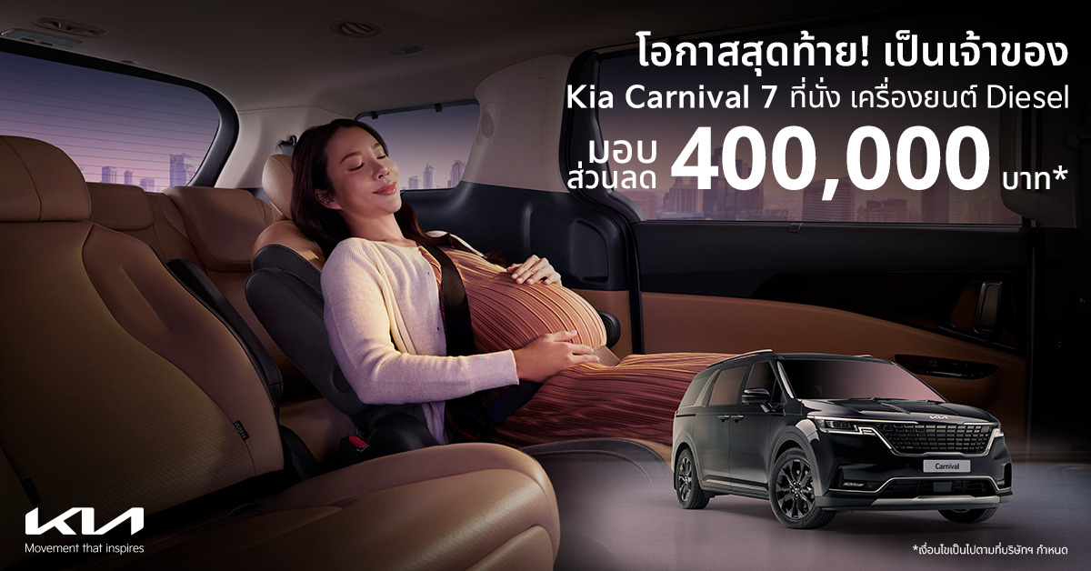 เกีย เซลส์ (ประเทศไทย) มอบข้อเสนอสุดพิเศษครั้งสุดท้ายกับการเป็นเจ้าของ The Kia Carnival SXL Luxury Diesel รุ่น 7 ที่นั่ง หนึ่งในรถ MPV อเนกประสงค์สำหรับครอบครัวที่ได้รับความนิยมสูงสุด ด้วยข้อเสนอราคาสุดพิเศษ 2,590,000 บาท จากราคาจำหน่ายปกติ 2,990,000 บาท รวมส่วนลดสูงสุดมูลค่า 400,000 บาท โอกาสสุดท้ายในการเป็นเจ้าของรถ MPV ดีเซลที่ครบที่สุดในคลาส มาพร้อมแพ็กเกจความคุ้มครองระดับพรีเมียมจากเกีย โปรโมชันนี้สำหรับผู้ที่จองและรับรถตั้งแต่วันที่ 1-31 กรกฎาคม 2568 เท่านั้น และจำนวนรถมีจำกัด