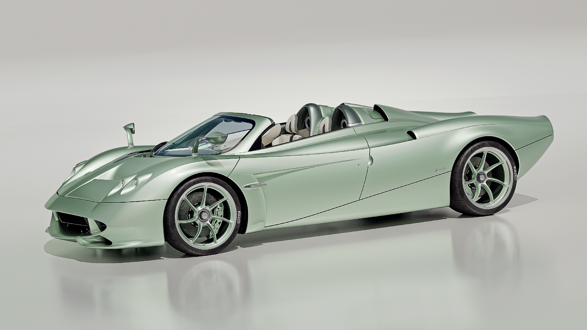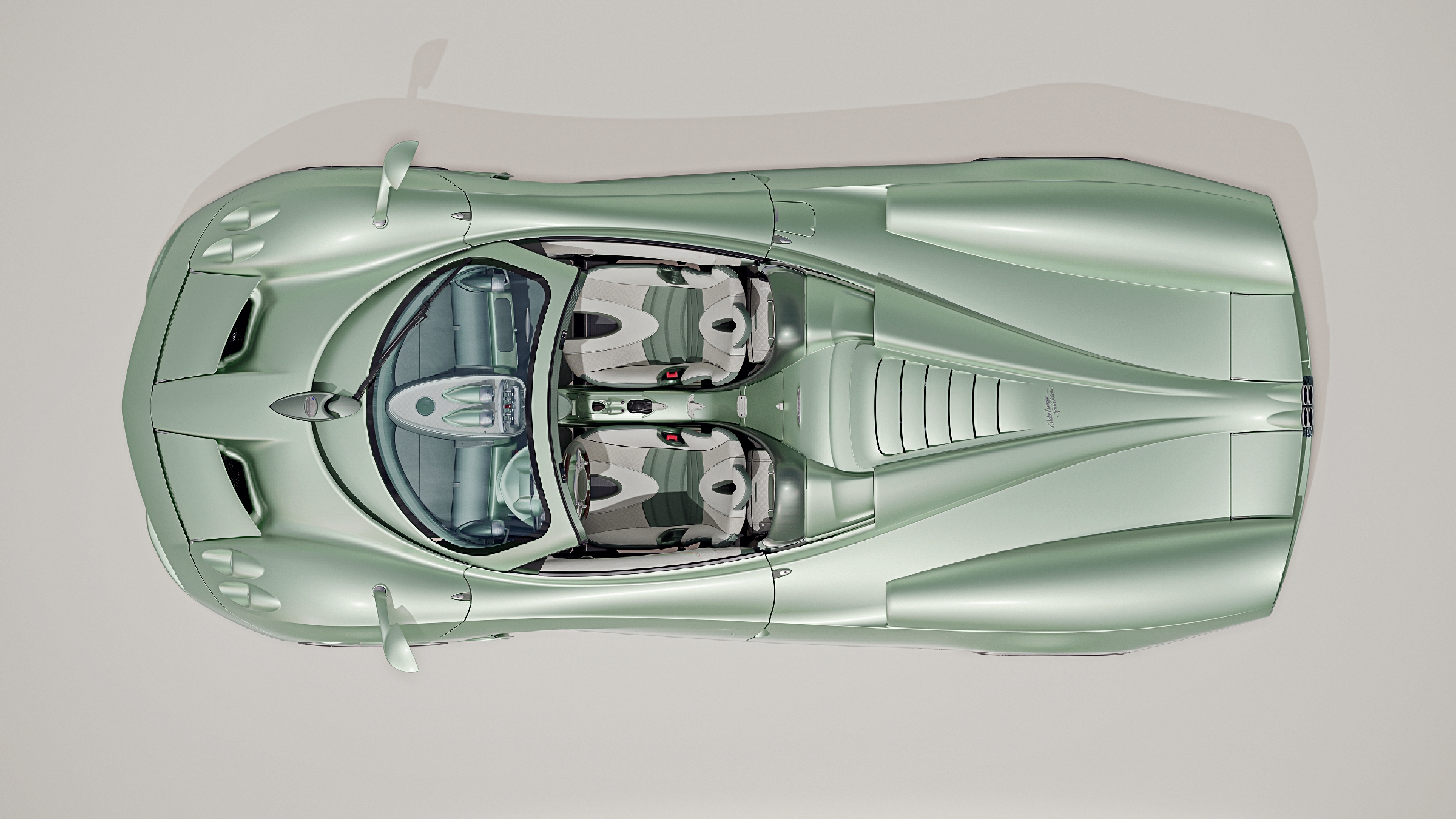 ข้างในห้องโดยสารก็ไม่ต่างจากงานศิลป์ระดับ haute couture ทุกตารางนิ้วถูกแต่งแต้มด้วยหนังเย็บมือ โลหะกัดขึ้นรูปจากแท่งตัน และวัสดุที่สัมผัสแล้วให้ความรู้สึกเหมือนกำลังจับสิ่งของโบราณที่มีเรื่องเล่า ฝีปักสุดพิเศษที่ใช้ตกแต่งเบาะและแผงประตู เป็นลายปักที่เคยออกแบบให้วงการแฟชั่นระดับสูง ก่อนจะถูกนำมาใช้กับรถยนต์เป็นครั้งแรก โดยลวดลายได้แรงบันดาลใจจากปลายท่อไอเสียสี่ท่อของ Pagani ที่กลายเป็นสัญลักษณ์อมตะของแบรนด์นี้