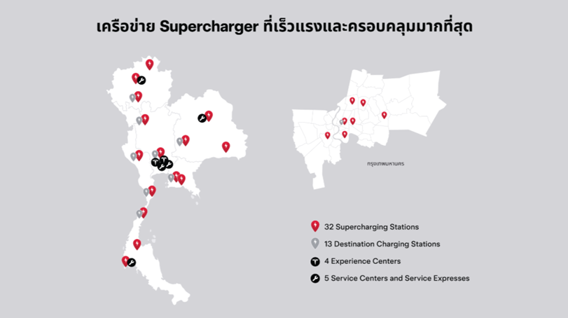 เครือข่ายการชาร์จและศูนย์บริการของ Tesla ประเทศไทย (อัปเดตล่าสุดเมื่อวันที่ 26 กันยายน 2568)