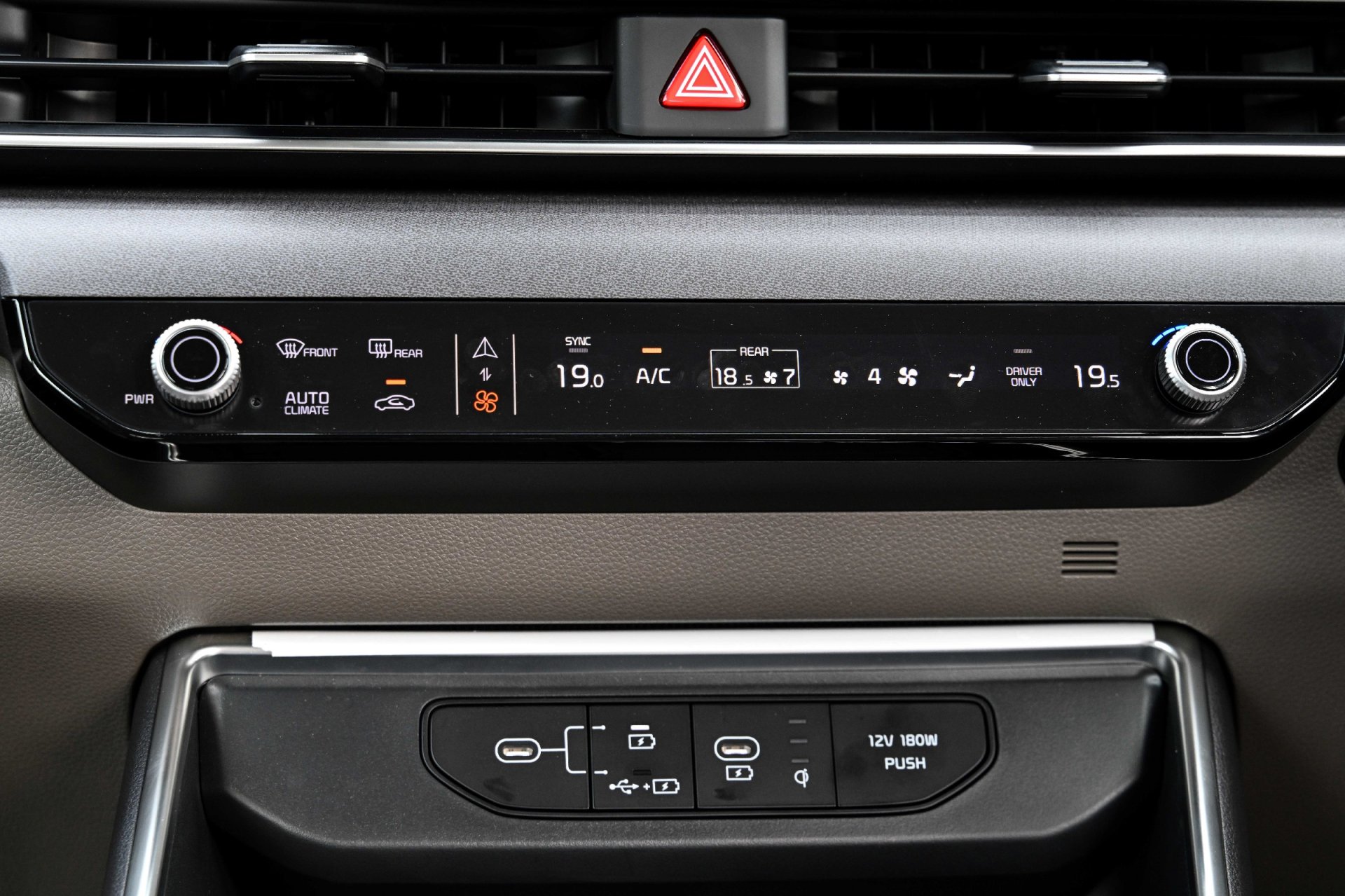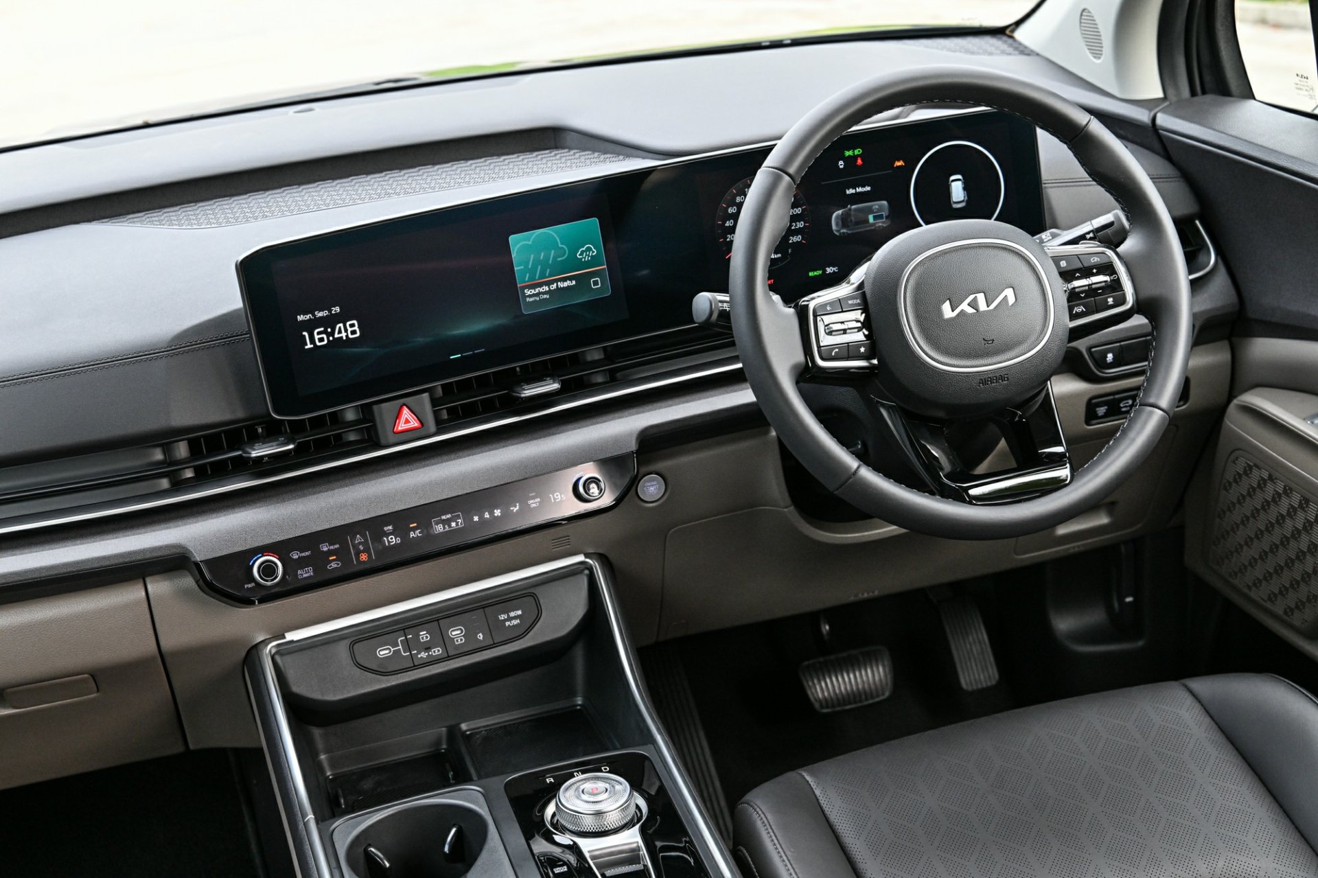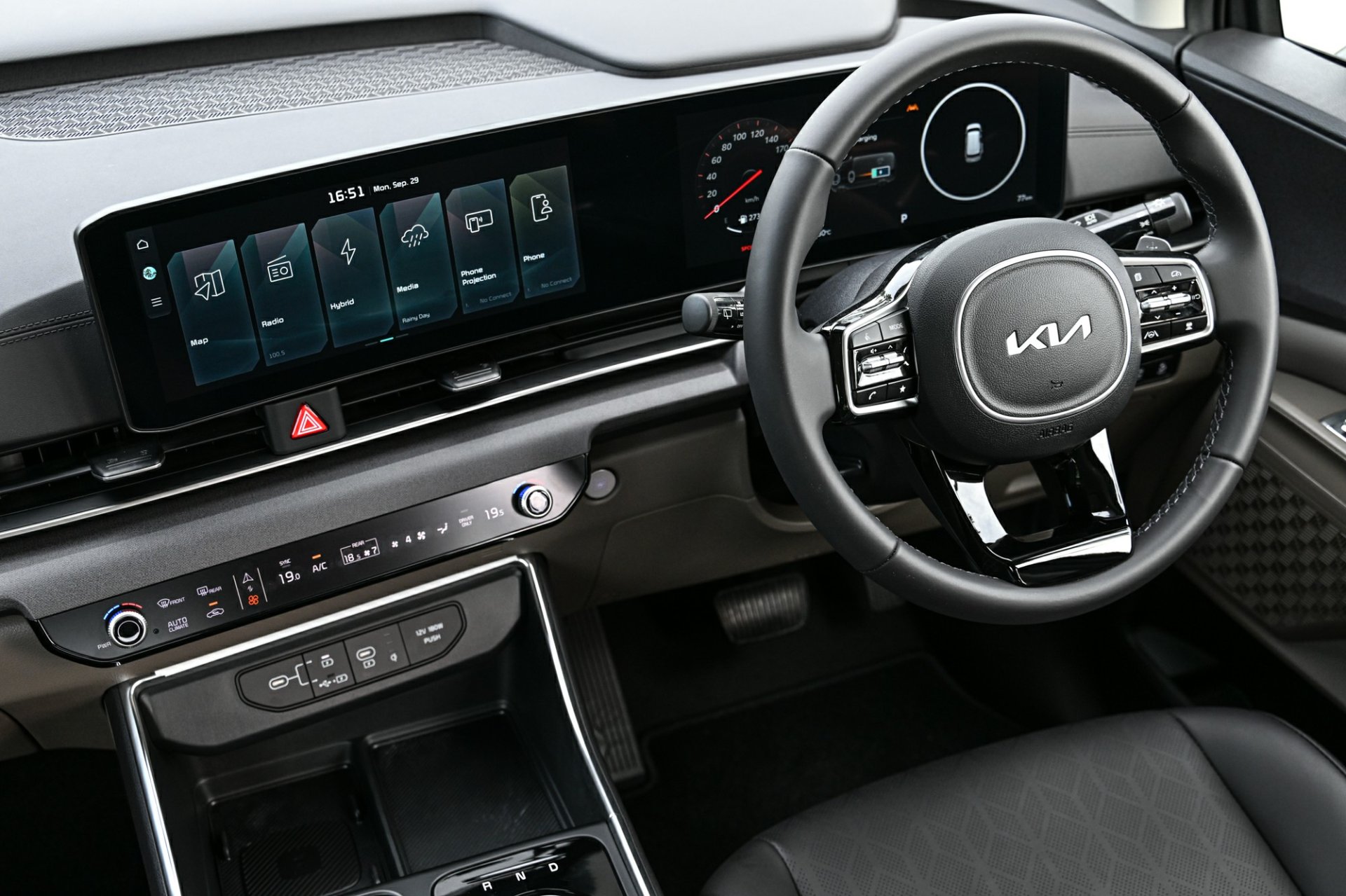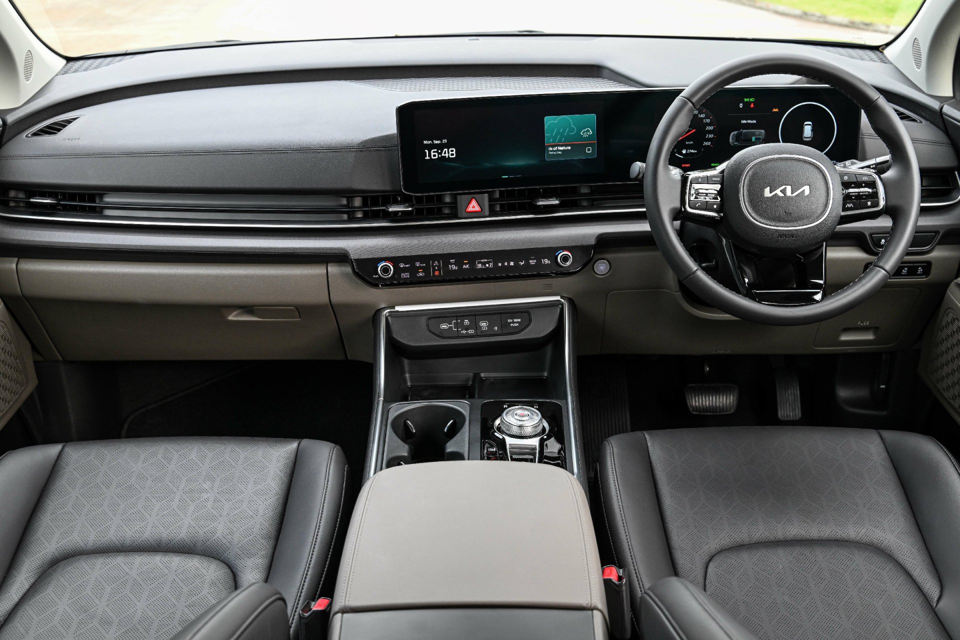 ห้องโดยสารของ The new Kia Carnival HEV 7-seater ได้รับการออกแบบให้กว้างขวางและร่วมสมัยด้วยดีไซน์ใหม่ ประกอบด้วยจอโค้งแบบพาโนรามิกที่ผสานรวมจอแสดงผลแบบคลัสเตอร์ขนาด 12.3 นิ้ว หน้าจออินโฟเทนเมนท์แบบสัมผัสขนาด 12.3 นิ้ว เข้าไว้ด้วยกันแบบไร้รอยต่อ มีระบบเชื่อมต่อ Android Auto™ และ Apple CarPlay® แบบไร้สายและฟังก์ชันสั่งงานด้วยเสียง มีระบบปรับอากาศด้านหน้าแบบอัตโนมัติที่สามารถปรับอุณหภูมิได้แบบแยกอิสระทั้งโซนด้านหน้าฝั่งซ้าย-ขวา และโซนด้านหลัง นอกจากนี้ ยังมีสวิตช์สำหรับสลับการควบคุมระบบอินโฟเทนเมนต์และระบบปรับอากาศที่ผสานการควบคุมทั้งระบบไว้บนอินเตอร์เฟซเดียวกัน เพียงแค่สัมผัสหนึ่งครั้งก็สามารถสลับการควบคุมไปมาระหว่างระบบอินโฟเทนเมนต์กับระบบปรับอากาศ ช่วยลดความซับซ้อนของเลย์เอาต์ในขณะที่ยังคงความสะดวกในการใช้งาน และภายในห้องโดยสารยังได้ติดตั้งพอร์ต USB-C มาตรฐาน รวม 6 พอร์ตกระจายทั้งสามแถวที่นั่ง ช่วยให้ผู้โดยสารสามารถชาร์จอุปกรณ์ของตนได้อย่างสะดวกไม่ว่าจะนั่งอยู่ตำแหน่งใดของตัวรถ
