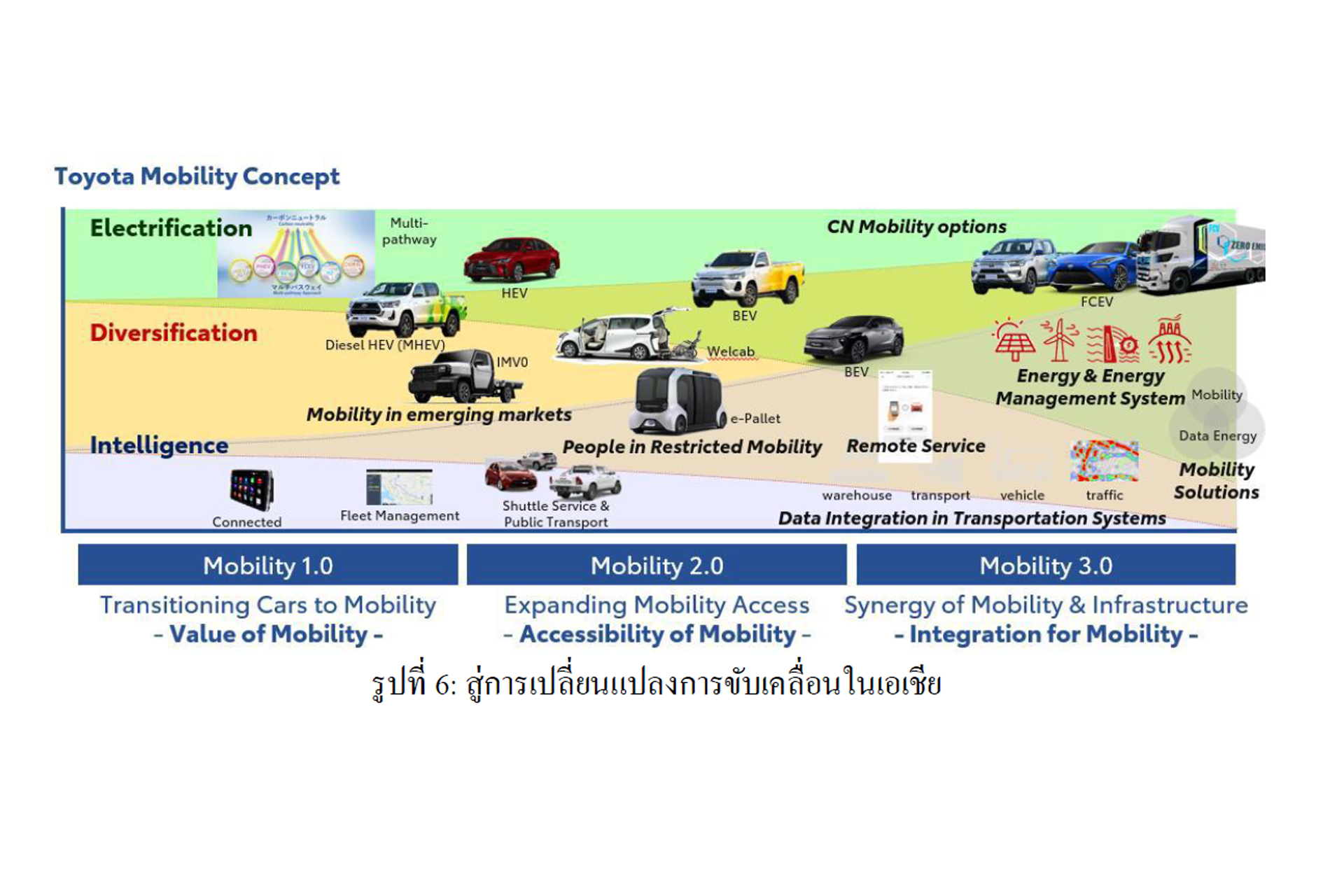โตโยต้าครอบคลุมแนวคิด Toyota Mobility Concept ที่ผสาน 3 มิติ ได้แก่ Mobility 1.0 ขยายคุณค่าของรถยนต์, Mobility 2.0 ขยายการเข้าถึงโมบิลิตีสู่โลกใหม่ และ Mobility 3.0 บูรณาการโมบิลิตีเข้ากับระบบสังคม เช่น การจัดการพลังงานหรือการจราจร ซึ่งทั้งหมดนี้สะท้อนว่า โตโยต้าไม่ได้แค่ขายรถ แต่สร้างระบบนิเวศใหม่ของการขับเคลื่อน
