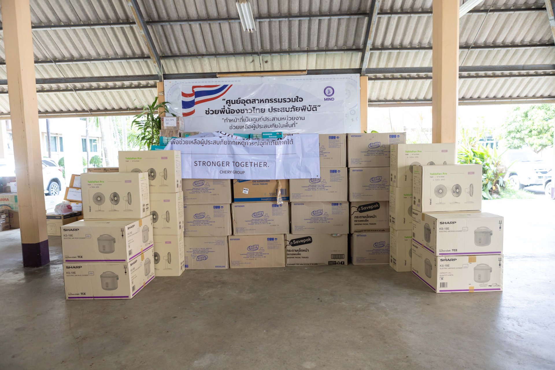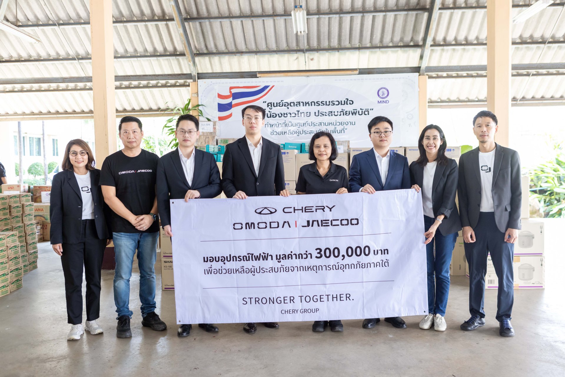 แบรนด์ CHERY ประเทศไทย เป็นตัวแทนส่งมอบอุปกรณ์ไฟฟ้า ประกอบด้วย ปลั๊กไฟ สายไฟ และสวิตช์ไฟฟ้า รวมถึงเครื่องใช้ไฟฟ้าที่จำเป็น เช่น พัดลม หม้อหุงข้าว ฯลฯ ซึ่งล้วนผ่านการรับรองมาตรฐานผลิตภัณฑ์อุตสาหกรรม (มอก.) เพื่อความปลอดภัยของประชาชน และได้เดินทางลงพื้นที่จังหวัดสงขลาพร้อมตัวแทนผู้จำหน่ายอย่างเป็นทางการในภาคใต้ เพื่อมอบอุปกรณ์ไฟฟ้าให้แก่ประชาชนผู้ประสบภัยน้ำท่วมด้วยตนเอง สะท้อนถึงความห่วงใยและความมุ่งมั่นของบริษัทในการช่วยเหลือสังคมไทยอย่างจริงจัง